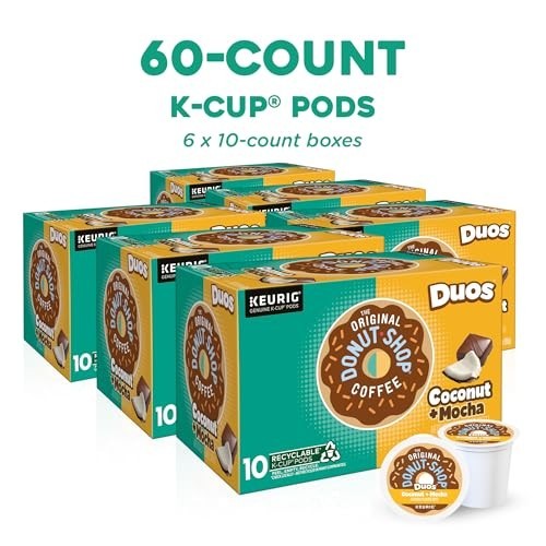 The Original Donut Shop Duos Coconut , Mocha Coffee, Keurig Single Serve K-Cup Pods, Medium Roast Coffee, 60 Count, 6 Packs of 10. Item description from the seller: Two bold flavors, that are great on their own, but even better together. The Original Donut Shop Coffee Duos Keurig K-Cup coffee pods ,blend two flavors that complement each other and the roast of the beans, giving you a uniquely delicious experience in every cup. Coconut ,Mocha K-Cup coffee pods feature tropically tasty coconut and chocolatey mocha flavors, combine to bring a tempting touch of the exotic to your every day. It’s a sweet surprise that tastes like vacation feels. These medium roast, caffeinated K-Cup coffee pods are engineered for guaranteed quality and compatibility with all Keurig K-Cup pod single serve coffee makers. TASTE: Tropically tasty coconut , chocolatey mocha flavors. ROAST: Medium Roast caffeinated coffee and is certified Orthodox Union Kosher. SUSTAINABILITY: Committed to 100percent responsibly sourced coffee. COMPATIBILITY: Contains genuine Keurig K-Cup pods, engineered for guaranteed, quality and compatibility with all Keurig K-Cup pod coffee makers. RECYCLABLE K-CUP PODS: Simple. Delicious. And Recyclable. Enjoy the same great tasting coffee, you know and love, and when you’re done just peel, empty and recycle. Check locally, not recycled in all communities. Packaging may vary.