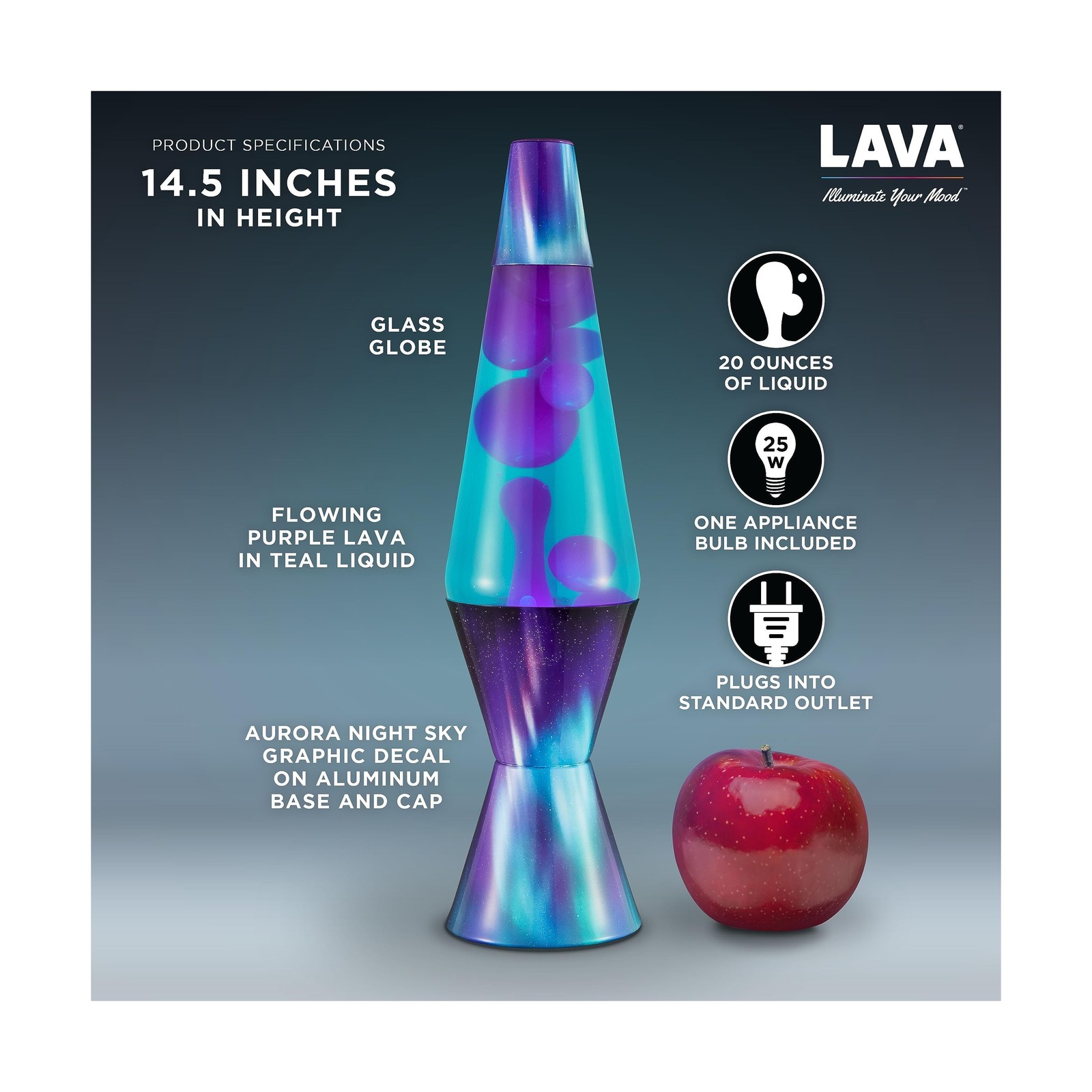 The Original Lava® Lamp - 14.5" Aurora Borealis – Classic Liquid Motion Lamp - Purple Wax and Blue Liquid - Item #2047 (Amazon Exclusive) Description Since 1965, LAVA has made this classic mezmerizing motion lamp a household name. Whether you are 10 or 60, in college or home decorating, there is a LAVA lamp to help you set the mood of your life. Introducing the 2023 LAVA lifestyle line, 14.5" lamps with soothing colors and unique, decorated bases. This lamp features a purple and blue base, purple wax, and light blue liquid. Makes a great gift, a conversation-starter, or a meditation aid. Make sure to read all instructions before use. After plugging in your lamp, wait 2-3 hours for wax to start flowing. Run the lamp a maximum of 8-10 hours per use and let the lamp fully cool before handling. Each lamp comes with an included power cord with a built-in switch. Make a statement with this original, classic LAVA lamp. Features: Beautiful Motion Lamp: Bring the relaxing colors of the Aurora Borealis into your life. Watch the colorful purple lava drift to the top of the lamp before it cycles back to the bottom through the teal liquid in a soothing, calming flow. Easy to Operate: After plugging in your lamp, wait 2-3 hours for your wax to begin flowing. For optimal performance, run your lamp no more than 10 hours at a time and allow it to cool completely before handling. Perfect Size for Gifting: This LAVA Lamp stands 14.5" tall, ideal for a coffee table, bookshelf, or desk. Give it as a gift or use it as a calming accent in any room. Top Quality: We make LAVA Lamps like we always have-- with top-quality materials and safety in mind. Make sure to read the included handbook and follow the tips to help your LAVA Lamp last a lifetime. Uses 1 S11 E17 25-watt bulb (included) The Original LAVA Lamp: Since 1965, LAVA has made this classic mezmerizing motion lamp a household name. Whether you are 10 or 60, in college or home decorating, there is a LAVA Lamp to help you set the mood of your life Product Details: Finish Type: Polished Base Material: Aluminum Bulb Base: E17 Product Dimensions: 4"D x 4"W x 14.5"H Lamp Type: Lava Lamp Finish Type: Polished Base Material: Aluminum Bulb Base: E17 Product Dimensions: 4"D x 4"W x 14.5"H Lamp Type: Lava Lamp Shade Color: Purple Shade Material: Glass Switch Type: Rotary Style: Retro Brand: Lava Color: Purple Special Feature: Portable Light Source Type: Incandescent Material: Glass, Metal Room Type: Bedroom, Desk, Living Room, Loft, Office Recommended Uses For Product: Decoration Power Source: Corded Electric Shape: Cylindrical Number of Light Sources: 1 Included Components: Bulb Is Waterproof: False Bulb Shape Size: S11 Mounting Type: Tabletop Wattage: 25 watts Number of Items: 1 Lighting Method: Uplight Control Method: Touch Indoor/Outdoor Usage: Indoor Specific Uses For Product: Decoration Water Resistance Level: Not Water Resistant Installation Type: Freestanding Number of Pieces: 1 Efficiency: Low Efficiency Voltage: 127 Volts Is Cordless?: No UPC: 019649517480 Assembly Required: No Model Name: 14.5" LAVA Lamp Global Trade Identification Number: 80 Product Benefits: Provides calming visuals and brings joy to users and guests Size: 14.5 pulgadas de alto Manufacturer: Schylling Shade Height: 14.5 Inches Theme: Lava Light Color: Purple, Blue Part Number: 20470400US Item Weight: 3.03 pounds Item model number: 20470400US Finish: Polished Pattern: Lamp Item Package Quantity: 1 Special Features: Portable Batteries Required?: No Warranty Description: Limited 90 day warranty. Date First Available: June 23, 2023 Delivery We Do Not Ship Outside of the Continental US. Return Policy All items qualify for returns within 30 days of receipt. Seller is responsible for return shipping on any item that is not damaged. Feedback We take our reputation seriously, we buy and sell online, so we understand the value of trust. If you are unsatisfied with your order, please contact us and we will work with you to resolve it to your satisfaction.