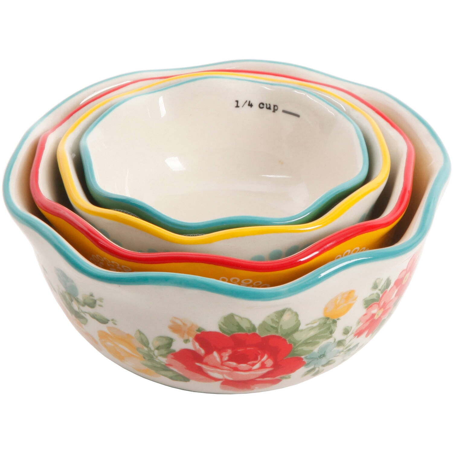 The Pioneer Woman 5-Piece Prep Set brings a touch of whimsy and fun to your space. Create all your favorite meals, snacks and desserts while enjoying their colorful appeal. This kitchen prep set includes a 4-cup liquid measuring vessel and a four-piece nesting measuring bowl set. Each piece is made of strong stoneware and features unique designs to brighten up any kitchen. The beautiful assortment of bold florals and subtle geos in The Pioneer Woman measuring cups makes it easy to mix and match. Meanwhile, the various sizes offer you a high degree of versatility. Use them for baking your favorite chocolate chip cookies, making cakes and much more. When you're finished, simply place everything in the dishwasher for convenient cleaning. On Feb 15, 2025 at 01:10:48 PST, seller added the following information:
