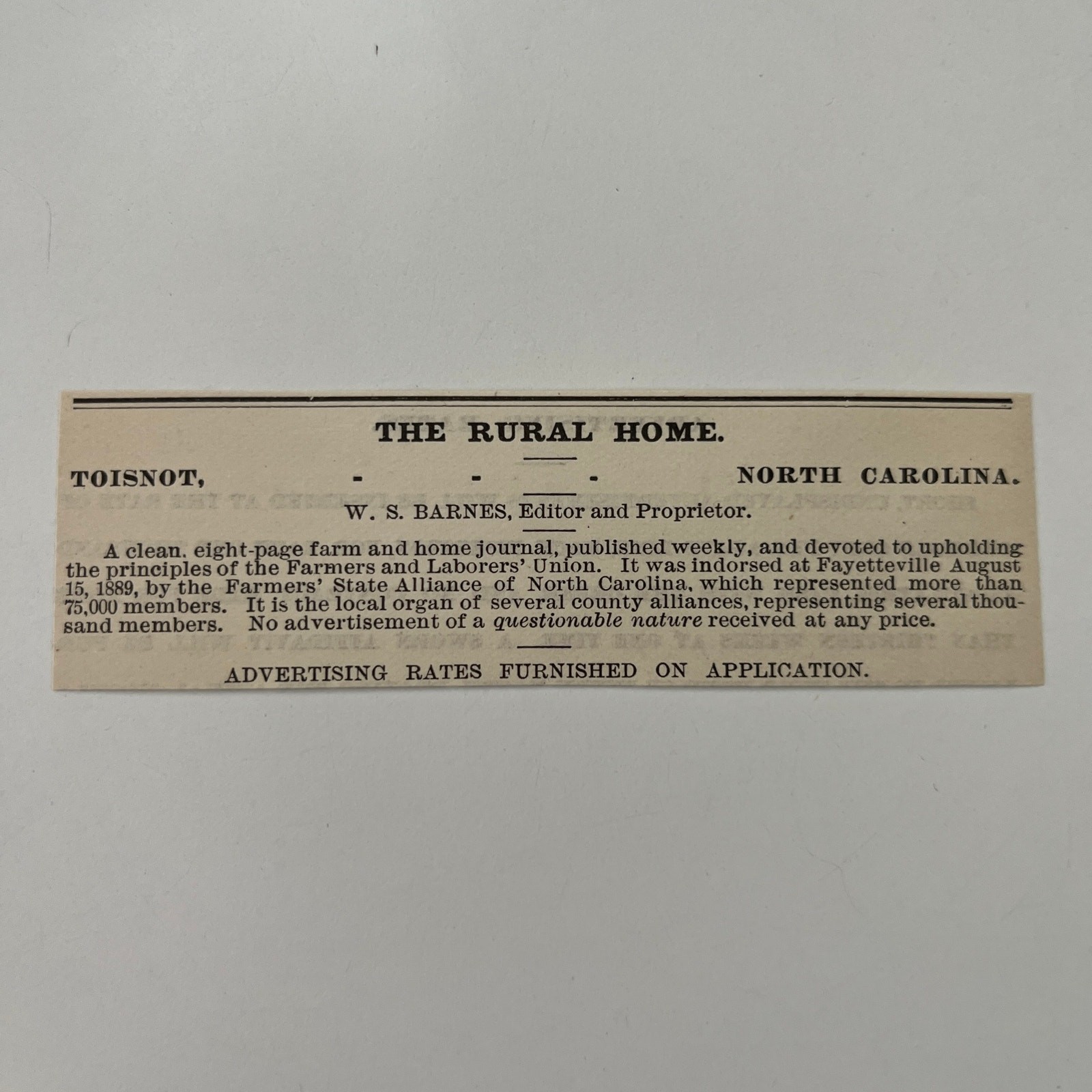 THIS IS A VERY SMALL ITEM. Measures approx 1x4". If you need an exact measurement please ask prior to ordering. Original piece taken from an 1890 Book: Geo P. Rowell & Company American Newspaper Directory. This is an old piece - may have small blemishes, etc that come with age. They may also have small tears, etc around the edges. See pics for condition. The Rural Home W. S. Barnes Home Journal Toisnot NC 1890 Newspaper Ad SAI9-M16