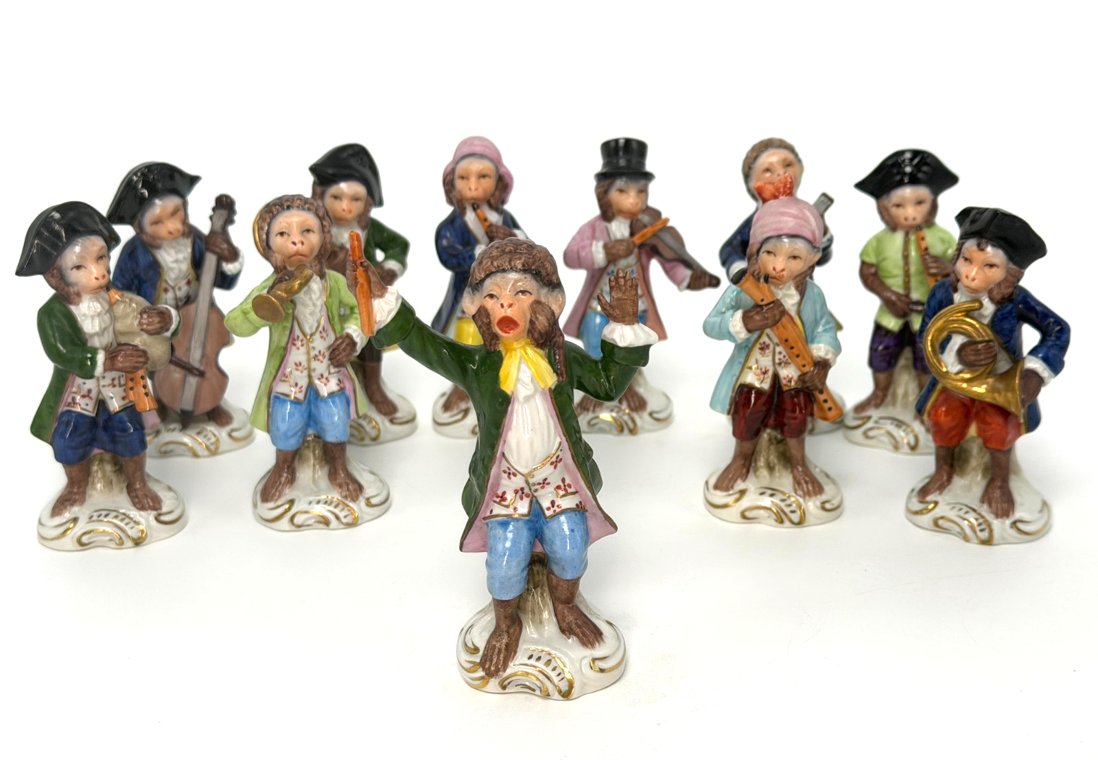 The Sitzendorf Monkey Band Rare near complete set of Eleven Sitzendorf porcelain monkey band figures, including a conductor, each raised on a gilt scroll enriched naturalistic base, blue printed marks to the undersides. Heights range from 9.8cm to 11.5cm All figures are in excellent condition, without damage. Sitzendorf porcelain is particularly known for its delicate, hand-painted figurines from the late 19th to mid-20th centuries. Produced by the Sitzendorf Porcelain factory in Thuringia, Germany, the production closed in 2012, but Sitzendorf pieces continue to be prized by collectors worldwide. Any questions please ask, thanks for looking! I try my best to photograph the items in a way which gives a true representation of the condition. Please do feel free to ask for more details or photographs if you want them. I hope you're happy with your item, but if not please get in touch and I'll try and put it right. Shipping Please be aware no matter the price of the item I always pack all items very very well, ensuring as best I can against any possible breakage during transit. If you want to buy several items and combine postage, please request a combined invoice. All the items I sell are available for free collection. For all items collected, postage costs will removed. Please contact me if you would like to collect items. Returns I accept returns if the buyer pays the return postage. International Buyers I will sell/send abroad via the Ebay Global Shipping Program. Feedback I will be delighted to leave positive feedback for all my buyers upon completion of all smooth transactions. Please leave feedback for me (which also lets me know that the item has arrived safely). If there are any problems please do let me know before leaving feedback. I can usually put any issues right if you give me a chance.
