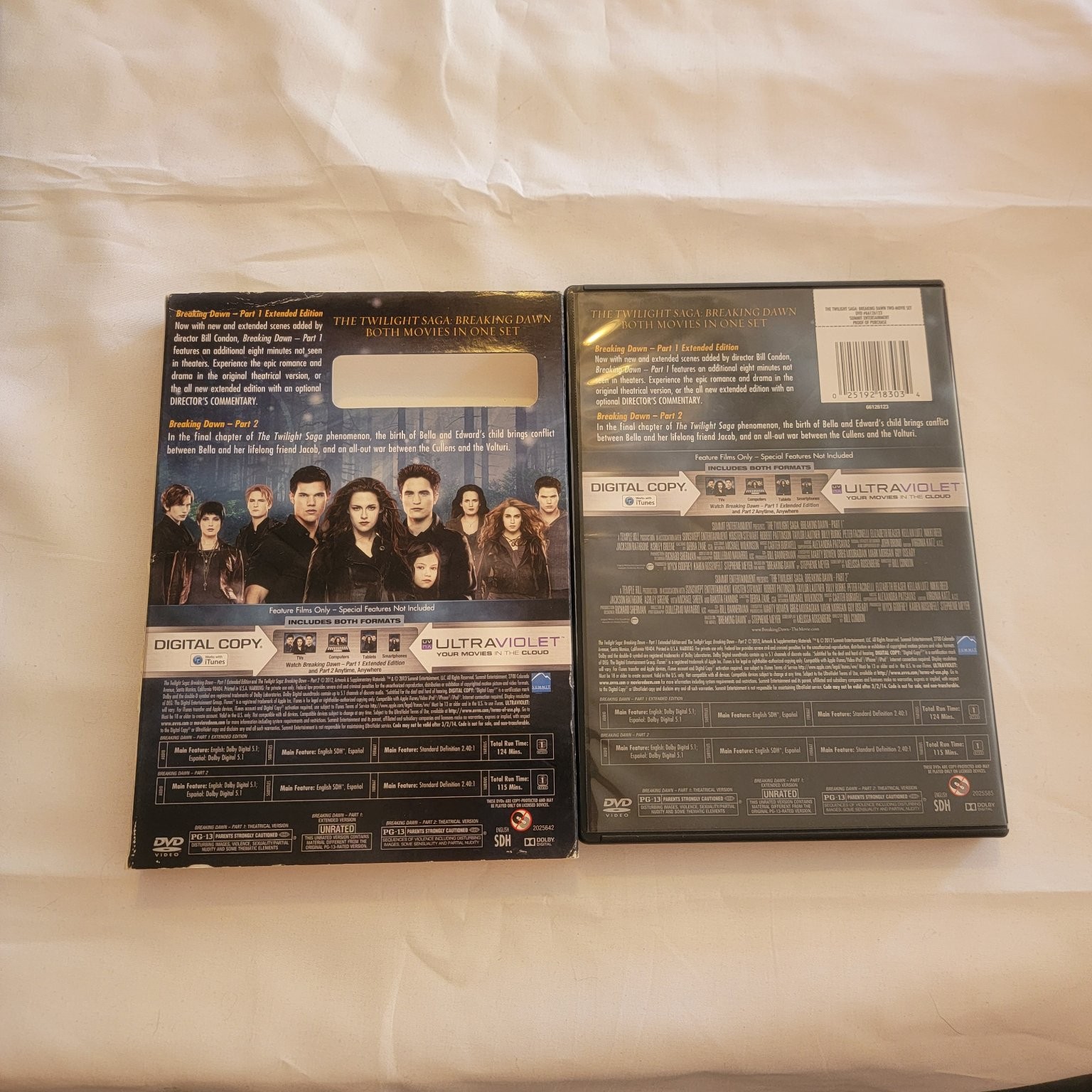 Experience the epic conclusion to The Twilight Saga with the Breaking Dawn Part 1 & Part 2 Two-Movie Set on DVD. This edition features the extended version of Breaking Dawn Part 1, including additional scenes not seen in theaters and an optional director's commentary by Bill Condon. Both parts chronicle the dramatic events surrounding Bella and Edward's marriage, the birth of their child, and the ensuing conflict with the Volturi. This special edition includes two discs per movie with both theatrical and extended cuts, offering a complete viewing experience. The set comes with a digital copy and Ultraviolet access for cloud viewing. Packaging includes a slipcover and standard DVD case, making it a great collectible for Twilight fans. Notable cast members include Kristen Stewart, Robert Pattinson, and Taylor Lautner, under the direction of Bill Condon.