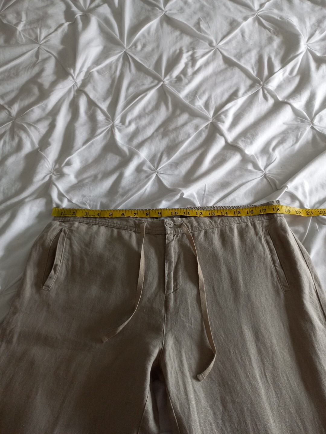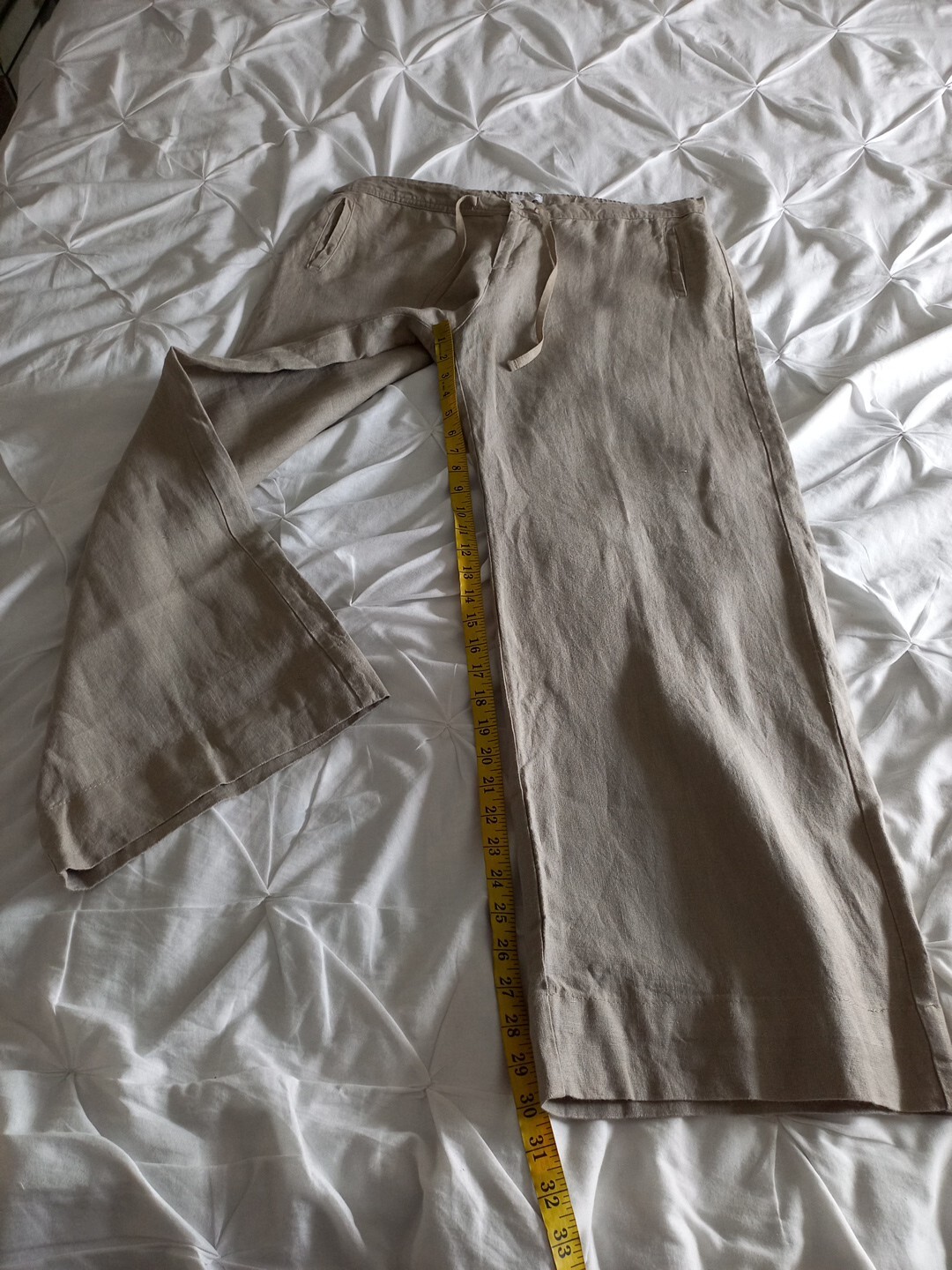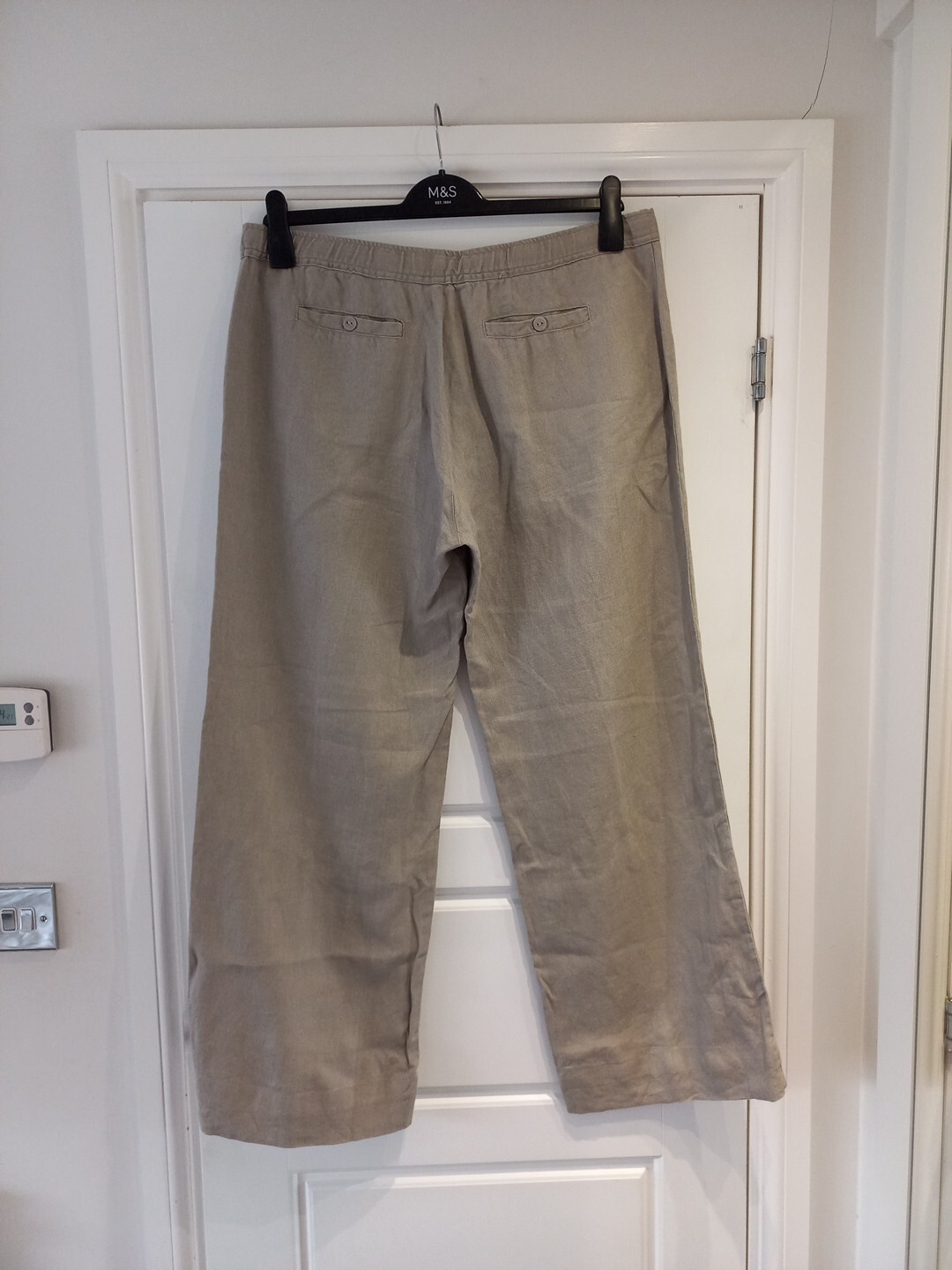 Elevate your wardrobe with these stylish grey linen wide-leg trousers from The White Company. Designed with a drawstring closure, these trousers are perfect for any casual or formal occasion. The trousers are available in size L which fits UK sizes 14-16. Crafted from high-quality linen material, these trousers are comfortable and durable. The trousers feature a regular size type and a wide-leg design that adds an elegant touch to your outfit. The grey colour complements any top or blouse, making it a versatile addition to your wardrobe. Perfect for any fashion-forward woman, these trousers are a must-have. Excellent condition Box57whiteVT