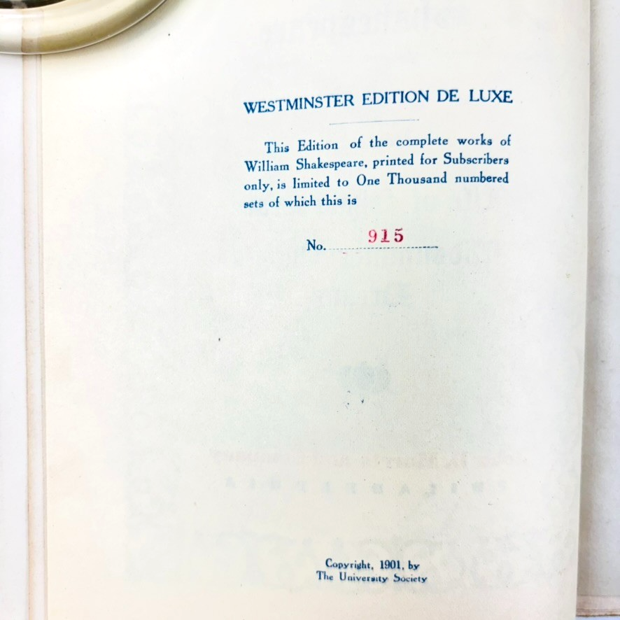 The Works of Shakespeare 1901 Westminster Edition DeLuxe Complete in 20 Volumes - Copy Number 915 of 1000 Printed - The University Society This lovely and complete set is in remarkably clean and crisp condition. ~ ~ ~ Please examine the photos closely. They are an important part of the description and represent the exact item you will receive. I am happy to provide more photos and answer specific questions about this book or any item in my store. I ship daily, both in the US and Internationally, and all orders are wrapped with care.