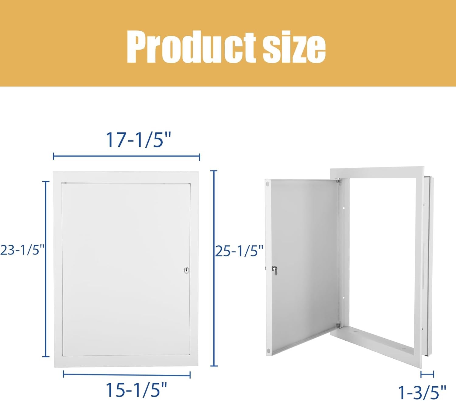 Thicken 1mm 16 x 24 Access Panel for Drywall,Attic Door, Ceiling Access Panel for Drywall,16x24 Metal Access Panels are Thickened to 1mm to Solve The Problem of Fragile Panels(Screwdriver Latch) Product size:Thicken 16 x 24 metal access door for drywall frame size 25 1/5'', access panel size 15 2/5'', inset depth 1 3/5'', Access panel 16'' x 24'' can keep flush with drywall or ceiling to allowing for overall aesthetics Thicken Metal door:Thicken ceiling access panel for drywall 16*24 made of aluminium with galvanised steel. Access door for drywall has rust resistant galvannealed steel to keep your interior access door from rusting and deterioration Surface treatment:Large access panel for drywall adopts advanced baking paint technology, baking paint layer surface uniformity, consistent color, no bubbles and no residual marks,these attic access panel can be installed as is or easily field painted if needed. suitable for attic access door,drywall panel,metal access door crawlspace access door Seamless welding technology:Attic access door seamless welding technology,drywall access door outer frame is equipped with two stiffeners to enhance the stability of the outer frame.strong and durable, smooth surface, no unevenness, no sharp corners, novel and beautiful