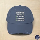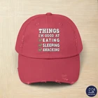 The funny design with the title Things I'm good at eating sleeping snacking. Go through life with a lot of humor, fun and happiness with this cool sarcastic, irony, self mockery motif. For friends and family to laugh together. PRODUCT DESCRIPTION Made with 100% cotton twill for high-end comfort and durability, these custom distressed hats bring all the style and practicality one needs in daily life. The low profile along with the D-ring closure on a self-fabric hideaway strap ensures both proper protection from the sun and that perfect, adjustable fit. .: 100% cotton twill .: Sewn-in label .: Closure: self-fabric hideaway strap with metal D-ring slider .: Printed using Direct to Film (DTF) technology .: Please note: Due to a special finishing process, distress and color may vary SIZE GUIDE Imperial One size Crown height, in 6.50 Width of front panel, in 7.37 Bill length, in 2.87 Metric One size Crown height, in 16.51 Width of front panel, in 18.73 Bill length, in 7.30