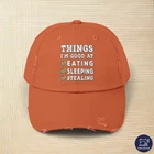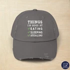 The funny design with the title Things I'm good at eating sleeping stealing. Go through life with a lot of humor, fun and happiness with this cool sarcastic, irony, self mockery motif. For friends and family to laugh together. PRODUCT DESCRIPTION Made with 100% cotton twill for high-end comfort and durability, these custom distressed hats bring all the style and practicality one needs in daily life. The low profile along with the D-ring closure on a self-fabric hideaway strap ensures both proper protection from the sun and that perfect, adjustable fit. .: 100% cotton twill .: Sewn-in label .: Closure: self-fabric hideaway strap with metal D-ring slider .: Printed using Direct to Film (DTF) technology .: Please note: Due to a special finishing process, distress and color may vary SIZE GUIDE Imperial One size Crown height, in 6.50 Width of front panel, in 7.37 Bill length, in 2.87 Metric One size Crown height, in 16.51 Width of front panel, in 18.73 Bill length, in 7.30