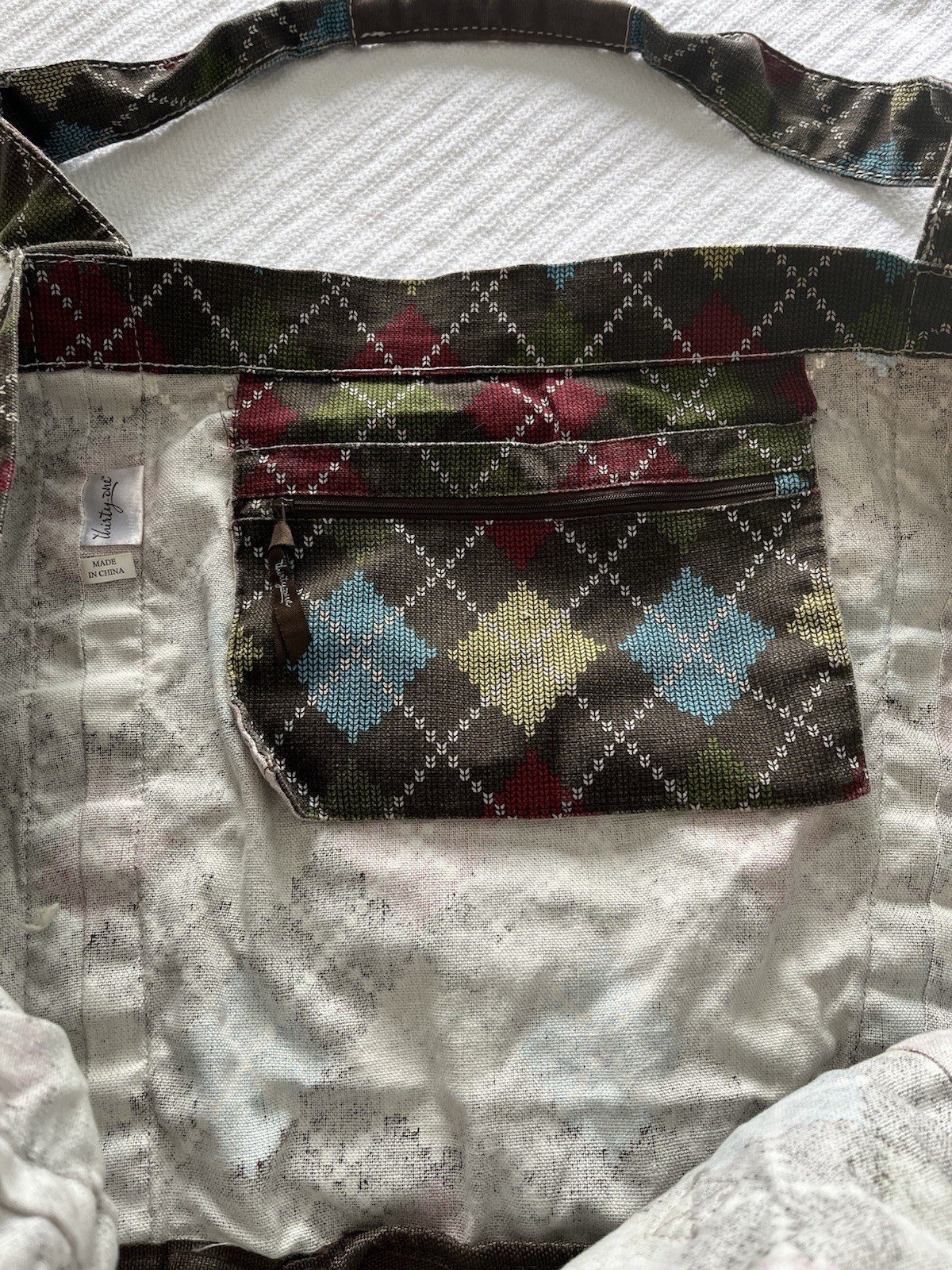 The Thirty-One 31 Windsor Argyle Large Expandable Tote Bag is a stylish and functional accessory perfect for fall and winter. This expandable tote bag features a classic argyle/diamond pattern on a multicolor exterior, with a zip closure and brown nylon handles/straps. The large size offers plenty of space for all your essentials, and the fabric lining provides durability and style. Ideal for women on the go, this tote is part of the Thirty-One Utility product line, known for its quality and versatility.