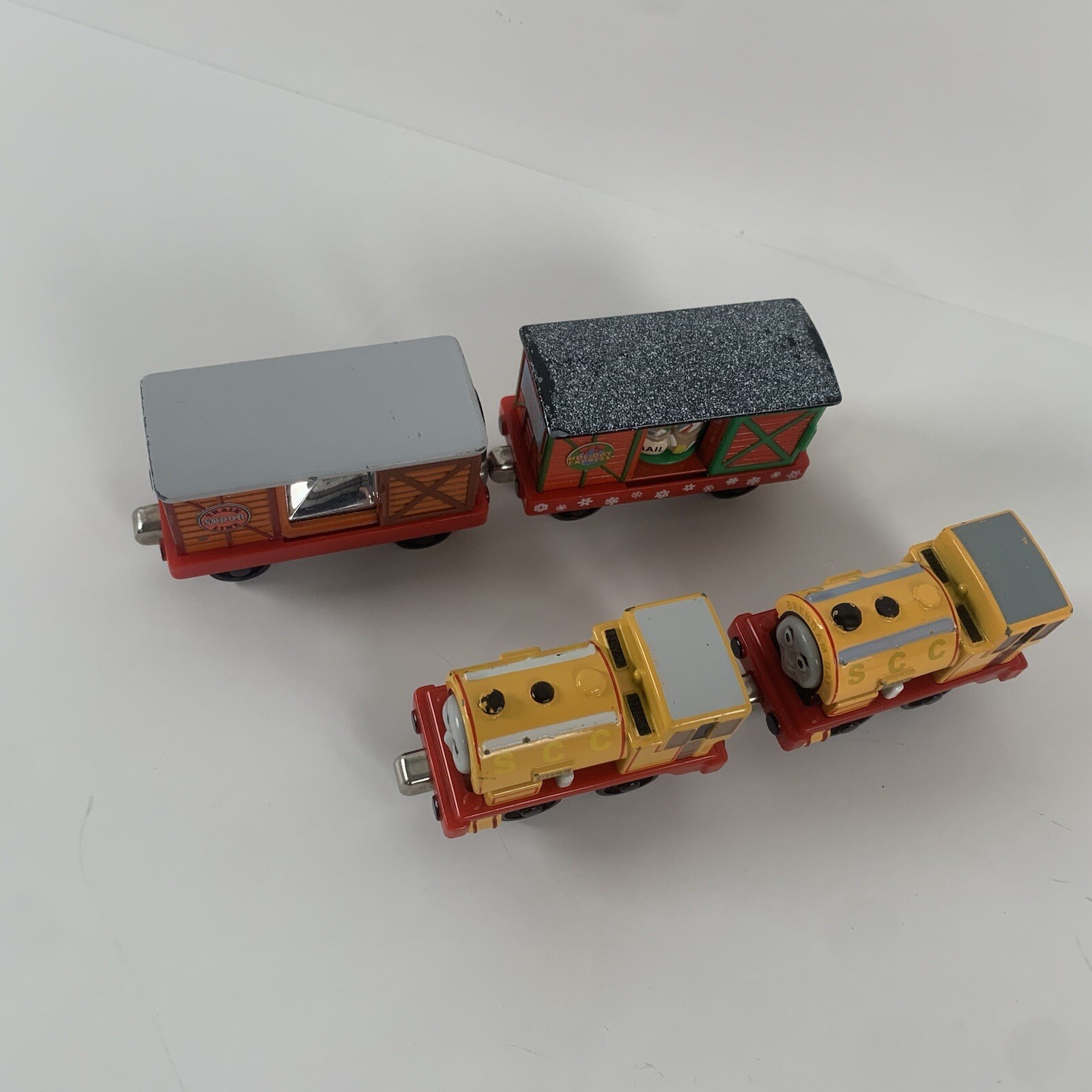 Bill, Ben, Holiday Box Car & Movie Car Thomas & Friends Take Along Learning Curve This listing is for all 4 train cars. The trains you see in the photos are the exact trains that you will receive. Please see photos for condition. I tried to take many photos from several angles so that you can see the condition well. This will ship out to you within 1 business day of purchase. Will ship out same day of purchase if paid for prior to 4:00 pm EST (Monday through Friday). I love super fast shipping when I make purchases online, so I take pride in getting your purchase to you quickly. This will ship to you in a sturdy shipping box (not a bubble mailer or poly bag) with plenty of padding and packing material to ensure that your item arrives undamaged. Thank you.