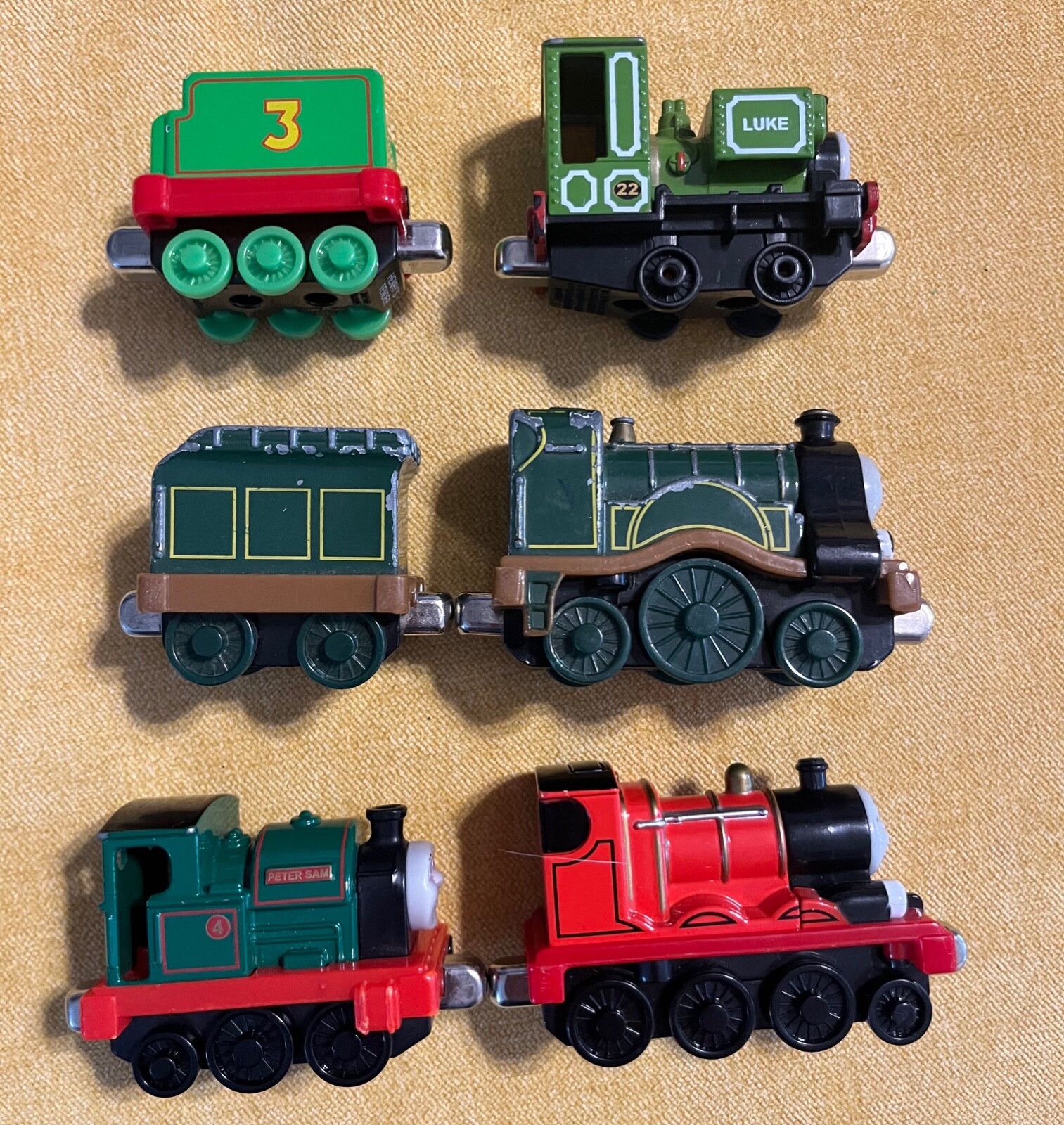 Lot of Thomas & Friends Take N Play diecast magnetic trains from 2009-2012. James and Emily are the talking versions but they are UNTESTED as I don't have the correct batteries for them. They may or may not work. Lot also includes Luke, Peter Sam, Henry's tender, and Emily's tender. Varying amounts of paint wear. Emily has the most wear. Please see photos I combine shipping
