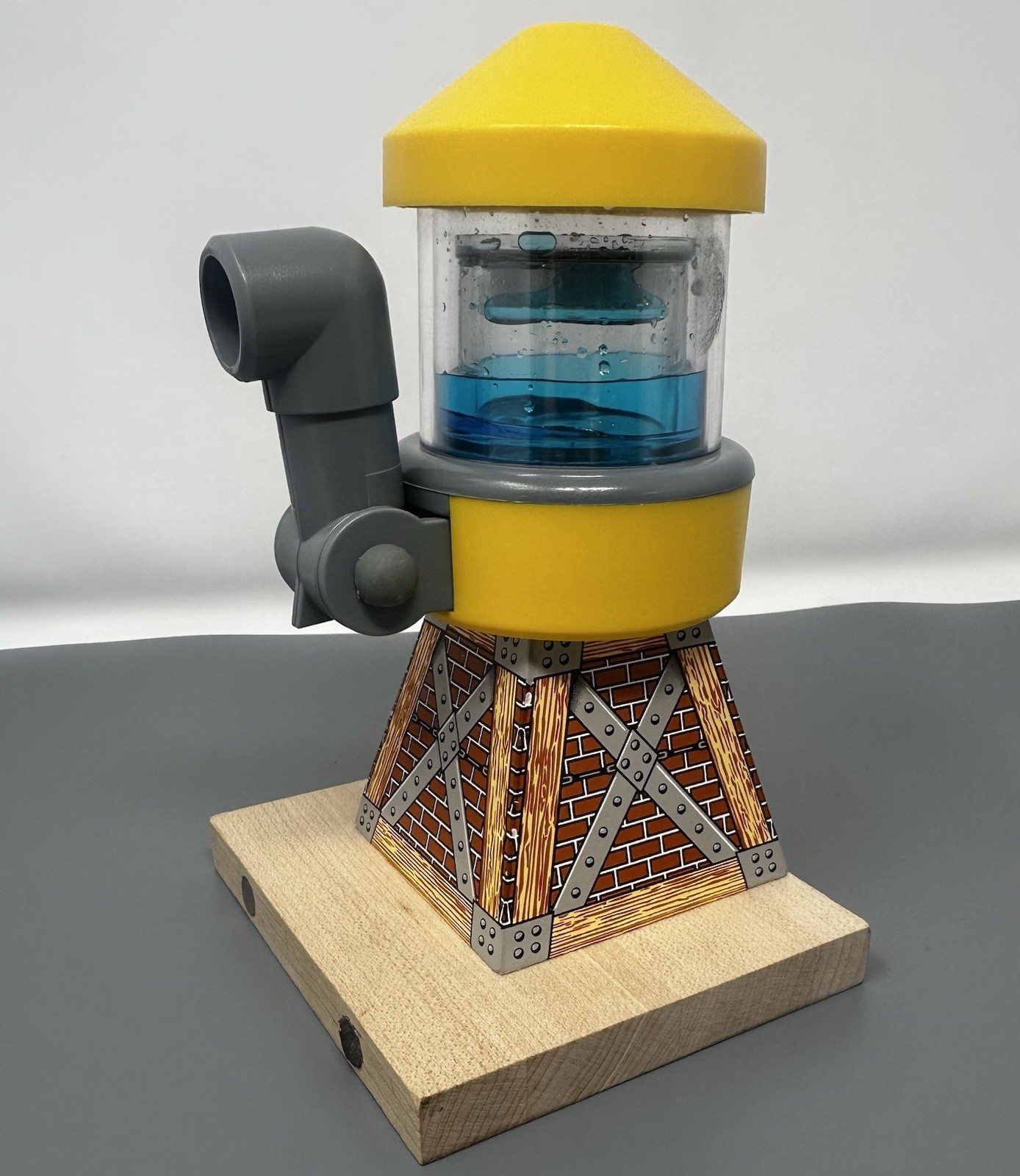 The Thomas & Friends Wooden Railway moving Water Tower Accessory is a vintage playset perfect for fans of the beloved TV show. Made of wood, plastic, and liquid in tower, this water tank accessory is designed to fit seamlessly into your Thomas & Friends wooden railway set. With a height of 6 inches and a length of 4 inches, this charming addition captures the essence of the show's iconic characters and themes. In excellent condition with no signs of wear. The liquid raises and lowers when moving the spigot.