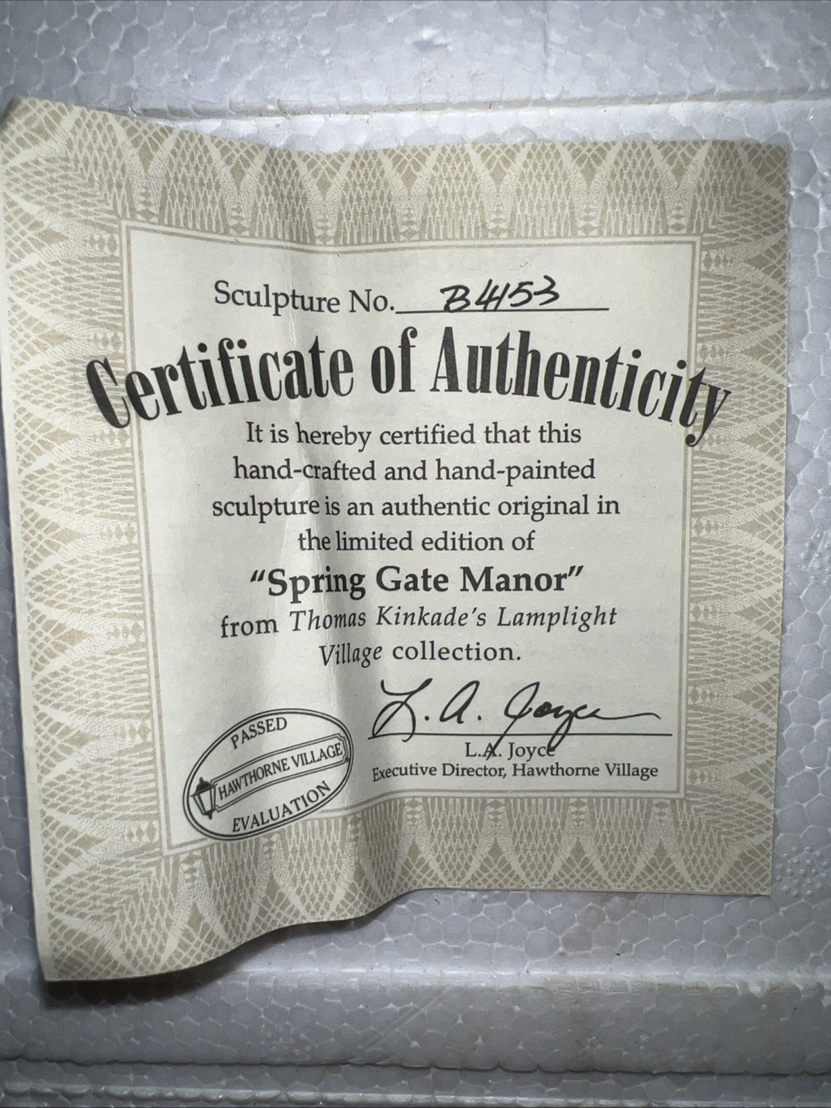 The Thomas Kincaid Hawthorne Village Spring Gate Manor is a beautifully handcrafted resin house from the Classic Collection. Featuring artwork by Thomas Kinkade, this piece captures the essence of spring with intricate details and a charming design. Perfect for collectors or as a sentimental gift for a special occasion, this unique village house adds a touch of nostalgia and elegance to any holiday or seasonal display.