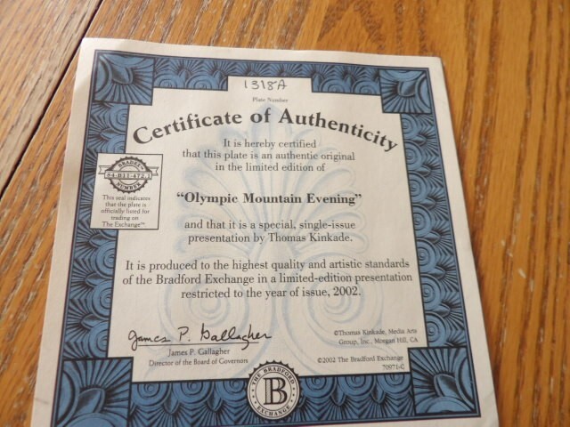 This beautiful Thomas Kinkade plate captures the serene glow of Olympic Mountain Evening perfectly. The colors are vibrant, and the condition is flawless—no scratches or flaws. It feels sturdy and well-made, just like a collector’s piece should. Came from a smoke-free home, so it’s clean and fresh. A lovely addition to any display!