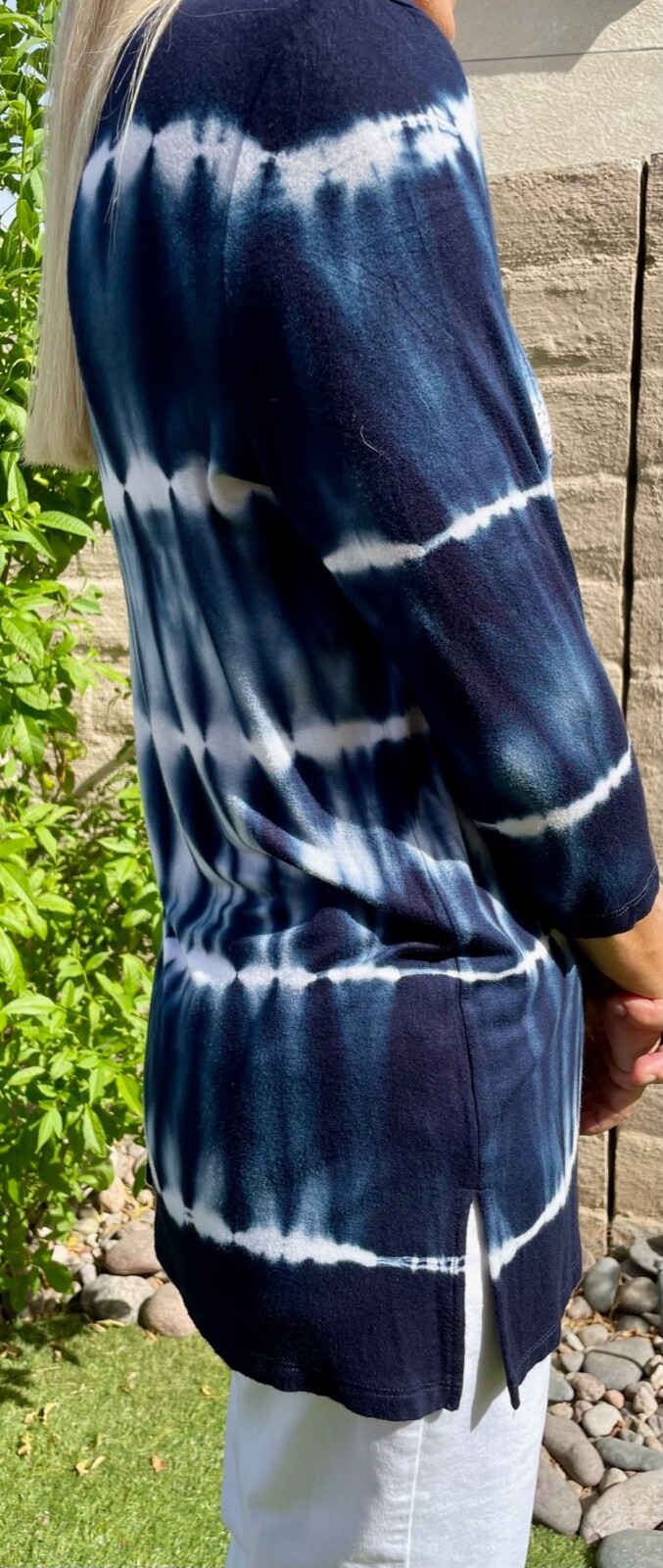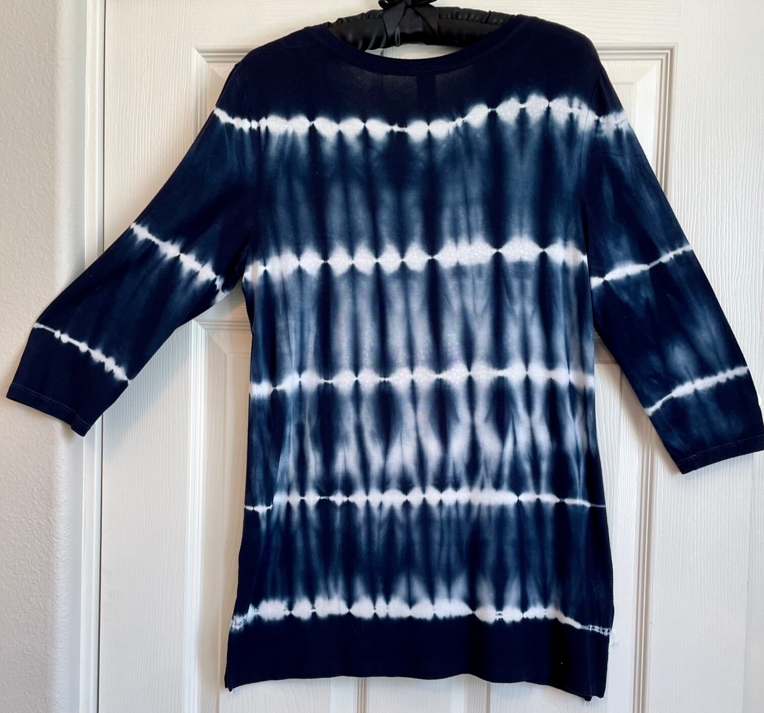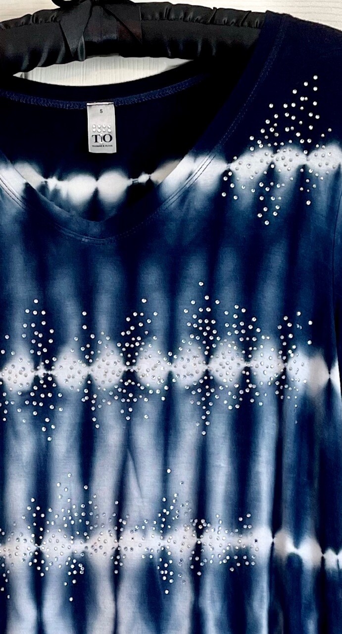 This tunic is absolutely stunning! The tie-dye pattern is vibrant, and the rhinestones add just the right amount of sparkle. Super soft and comfy, fits true to size. Barely worn—looks brand new. Love the flowy length and flattering cut. Perfect for dressing up or keeping it casual. A must-have in any wardrobe!