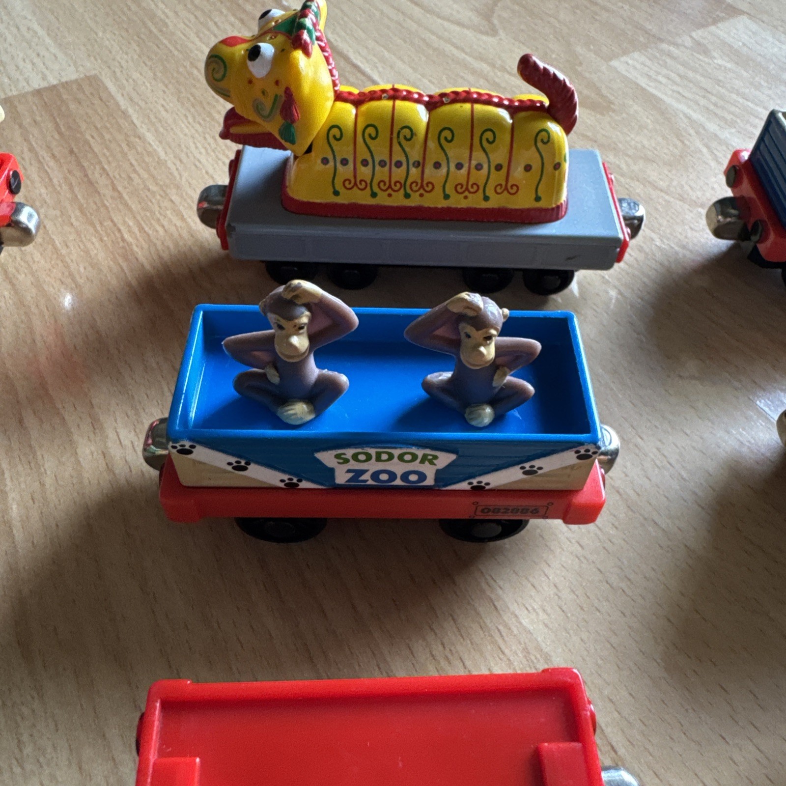 15 Thomas & Friends Die-Cast & Plastic (2002-2012) Cargo Car Lot Send me a message if you have any questions. - Spotlight Car - 2004 Hose Car - 2004 Dinosaur Car - 2006 Sea Cargo Car - 2006 Present Car - 2004 Monkey Car - 2006 Lion Car - 2006 Chinese Dragon - 2003 Troublesome Truck - 2003 Green 3 Red 5 Orange with Red Green Yellow - - The product is a lot of 15 Gullan magnetic cargo cars featuring the character Thomas the Tank Engine from the popular franchise Friends. These die-cast metal action figures are designed to interact with the train vehicle type, making them a fun and interactive toy for young fans of the show. Perfect for playtime or collecting, these cars are sure to bring hours of entertainment to any young Thomas enthusiast.