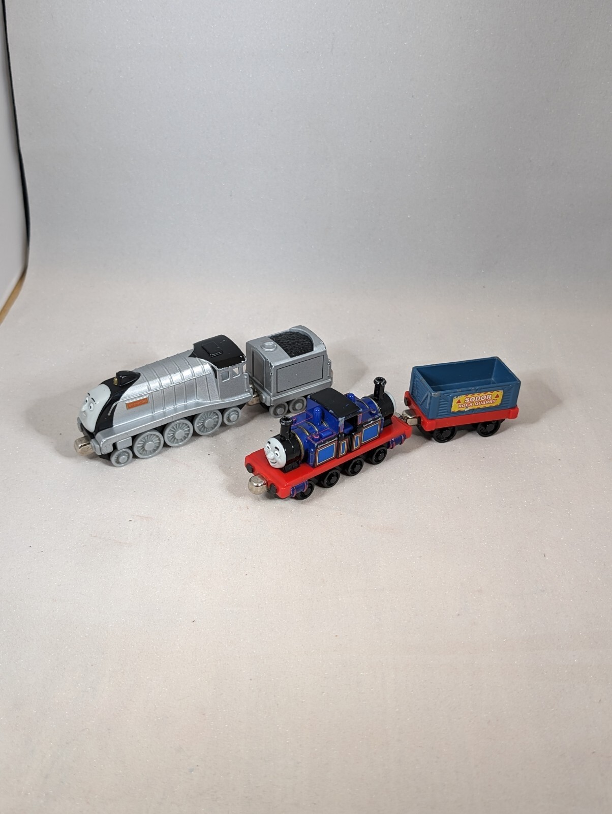 Expand your little one's Thomas & Friends collection with this lot of 12 trains and vehicles. Made from die-cast material, these toys are durable and perfect for playtime. The lot includes action figures of six different characters - Terrence, George, Mighty Mac, Spencer, Duncan, and James the Red Engine. These Thomas & Friends toys are from the 2000-2009 time period and are split between Mattel and Learning Curve brands. The collection is perfect for any young fan of the Shining Time Station TV show and the Thomas & Friends franchise. Add these unique and high-quality toys to your child's collection today!