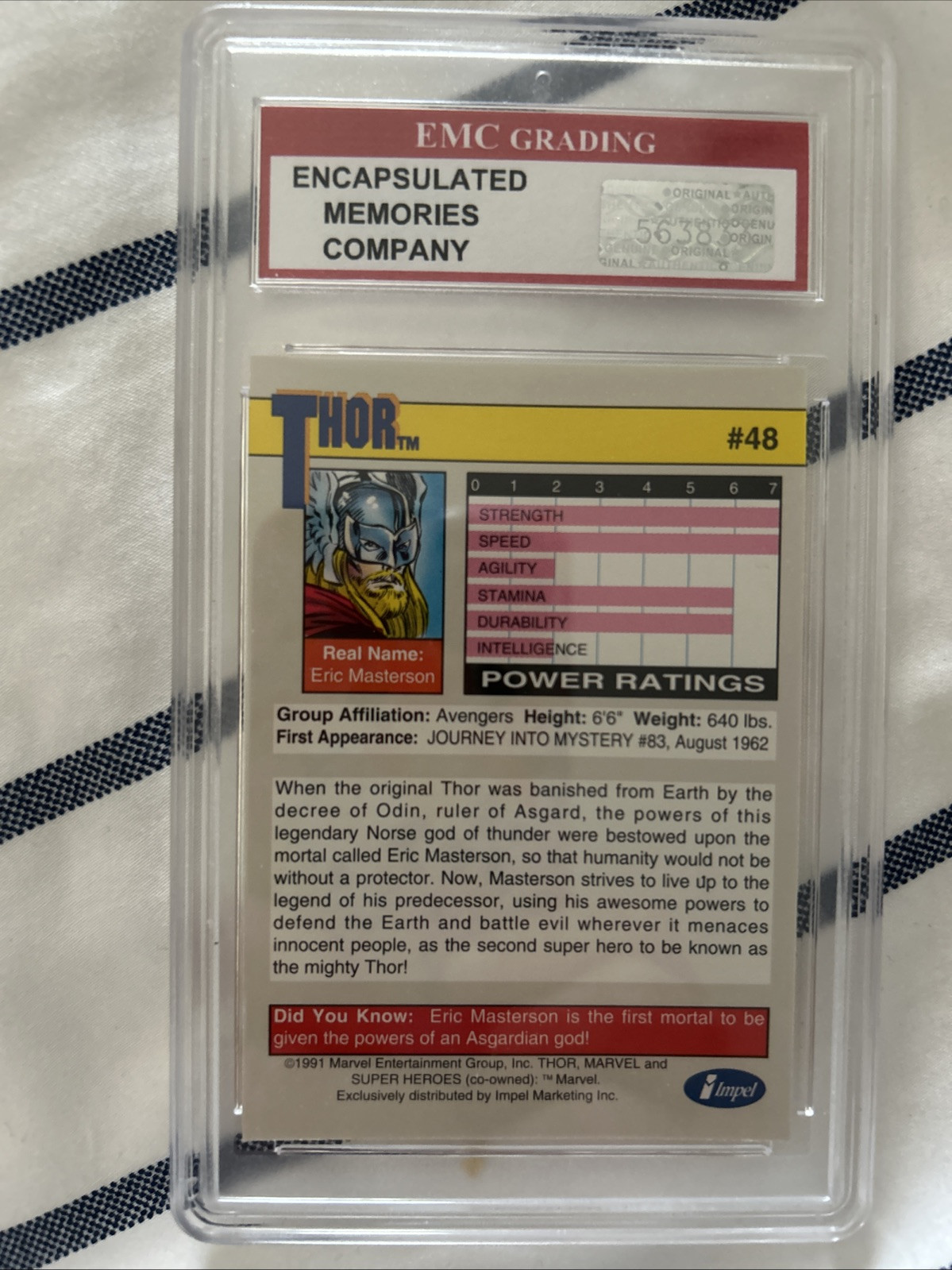 The product is a 1991 Marvel Universe trading card featuring Thor from the Avengers. It is part of the Super Heroes subset, with artwork by Stan Lee and showcasing actor Chris Hemsworth as Thor. The card is produced by Impel and is a part of the base set. The card is in GEM MINT condition and is a standard size non-sport trading card printed on card stock in English. Graded by EMC grading.