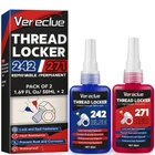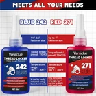 Thread Lock 50ml Blue 242 and 50ml Red 271, Medium Strength and Strong Strength Lock Tight Threadlocker, Thread Locker for Metal Fasteners, Nuts, Bolts to Against Losening and Seal Product Details Package Dimensions : 7.05 x 4.21 x 2.32 inches; 5.61 ounces Manufacturer : Vereclue Country of Origin : China Material: Metal Brand: Vereclue Style: Industry Compatible Material: Metal Item Form: Liquid Value 2-Pack Thread Lock: Medium-strength blue threadlocker 242 and high-strength red threadlocker 271, providing a wide range of options for your various needs. For all household iterms with screws, thread locker can fasten bolts & nuts for a long time to avoid loosening due to vibration, and prevent the bolts from corroding and rusting. Family must-have to extend the life of items and safe using Waterproof and Anti-rust: Using lock tight threadlocker cores instead of solid gaskets, close contact, perfect sealing, heat-resistant and waterproof, provide a strong and consistent lock ensuring durability against leakage, corrosion, and loosening, ideal for indoor and outdoor use Easy to Use: Simply apply the locktight thread locker evenly to the Fixing Position of the Bolt & Nut, tighten the nut, and cure initially for 20 minutes, then fully cure within 24 hours. Screws coated with medium-strength threadlocker can be removed directly with hand tools Wide Application: Whether you're working on automotive repairs, tightening furniture screws, or handling industrial tasks, blue threadlocker and red threadlocker's reliable performance and versatility make it ideal for automotive, industrial, and furniture use, eliminating the need to stock up on expensive lock nuts and washers, saving your money and time After-Sales Service: If you are not satisfied with the screw lock glue you received, or the thread locker spilled due to transportation, you can contact us at any time and we will provide you with satisfactory service
