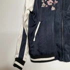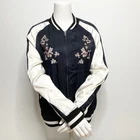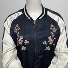 A beautiful reversible satin jacket featuring intricate floral embroidery. This stylish jacket offers versatility with its reversible design, allowing you to switch between two different looks. The stunning floral embroidery adds a touch of elegance and charm, making it a perfect addition to any wardrobe. Ideal for layering over casual or semi-formal outfits, this jacket combines comfort and style in one unique piece. Measurements: Bust 22, Length 25.5