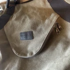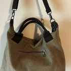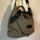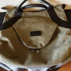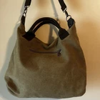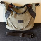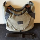 The Threaded Pear Everyday Tote Canvas Messenger Bag is a large, stylish and functional bag perfect for everyday use. Made from durable canvas fabric in an olive green color, this messenger bag features a zip closure, double brown handles with a 6-inch drop, and an adjustable removable shoulder strap for added versatility. With inner dividers and multiple pockets, this bag is ideal for travel, casual outings, workwear, and business. In excellent like new condition with no signs of wear, damage or odors.