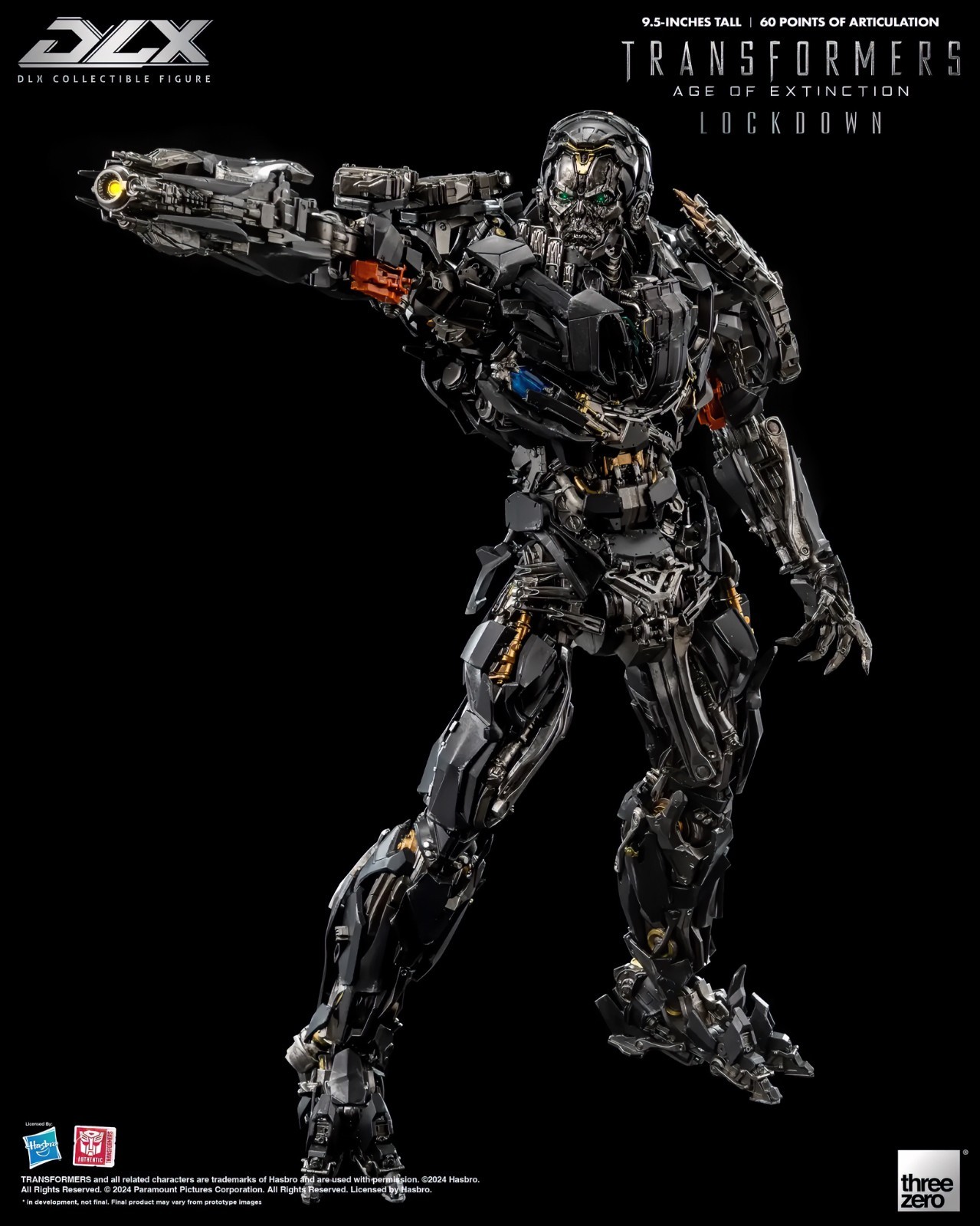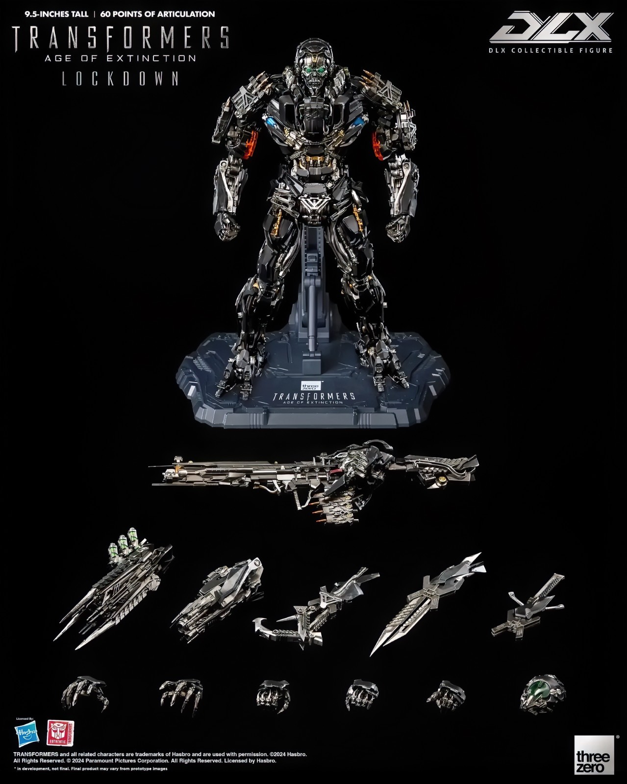 This is genuine threezero DLX Lockdown Transformers: Age of Extinction Collectible figures and is brand new product. Currently the shipping time will take around 15-20days. If you accept this, feel free to place your order. please be sure to consider carefully before placing the order, as cancellations are not accepted once the order is confirmed. Please make sure to contact me before placing an order to avoid any unnecessary misunderstandings. Sometimes, due to transportation reasons, the outer packaging box may experience some compression or deformation. However, this will not damage the product. The purpose of the packaging box is to protect the product from damage. hope you understand. The estimated delivery time shown for your order is the longest possible timeframe, designed to account for any unforeseen delays like flight or customs holdups. In most cases, your order will arrive much sooner. Thank you for your understanding! threezero is proud to present the infamous bounty hunter and hired assassin from the movie Transformers: Age of Extinction, DLX Lockdown! Standing approximately 9.5 inches (~24cm) tall, Transformers: Age of Extinction DLX Lockdown has approximately 60 points of articulation and features die-cast metal parts with an engineering-grade plastics frame, which allows for a dynamic range of poseability, durability, and excellent stability. DLX Lockdown features an incredibly detailed sculpt with threezero’s signature weathered paint application in order to replicate the appearance as seen in the movie, numerous weapon accessories grant the ability to recreate various battle scenes. DLX Lockdown contains an impressive attention to detail. His eyes are equipped with LED light-up effects (requires AG13 batteries x 2, batteries not included). Accessories include a Battle Mask with transparent piece, a Face Cannon, a Spark Extractor, a Blaster, a Hook, an Arm Blade and a Knife. The Battle Mask can be magnetically attached to the figure’s head, the Face Cannon and Blaster are all equipped with LED light-up effects (each requires AG3 batteries x 2, batteries not included). When paired with the 4 sets of interchangeable hands (one pair of fists, one left pointing hand, one pair of action hands, and one pair of weapon-holding hands) and the DLX action stand, it makes for an impressive display. TRANSFORMERS and all related characters are trademarks of Hasbro and are used with permission. ©2024 Hasbro. All Rights Reserved. © 2024 Paramount Pictures Corporation. All Rights Reserved. Licensed by Hasbro Description Transformers: Age of Extinction Merchandise Name DLX Lockdown Specifications FEATURES Officially Licensed by Hasbro Approximately 9.5 inches (24 cm) tall Approximately 60 points of articulation Die-cast Metal frame design with advanced range of articulation Detailed and weathered paint application LED illuminated eyes* and weapons* Magnetic Head part# Battle Mask with transparent piece# ACCESSORIES One (1) Battle Mask One (1) Face Cannon* One (1) Spark Extractor One (1) Blaster* One (1) Hook One (1) Arm Blade One (1) Knife Four (4) sets of interchangeable hands: one (1) pair of fists, one (1) left pointing hand, one (1) pair of action hands and one (1) pair of weapon-holding hands One (1) DLX action stand LED FEATURES* Eyes Face Cannon Blaster Remarks * Eyes require AG13 batteries x 2, batteries not included * The two weapons require AG3 batteries x2 each (4 in total), batteries not included # Include Magnets Materials PVC, ABS, POM, die-cast zinc alloy and magnets Packaging Size ~ (W375 x D305 x H125) mm (2 kg)