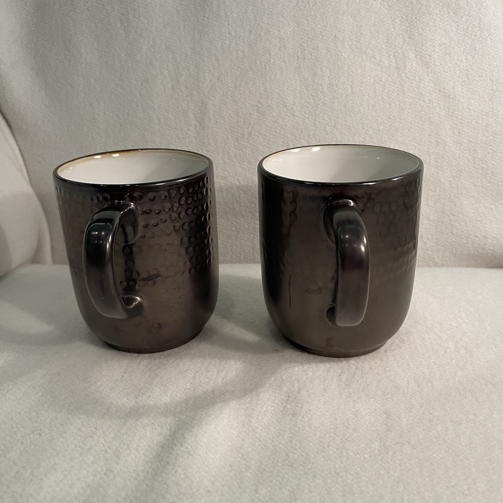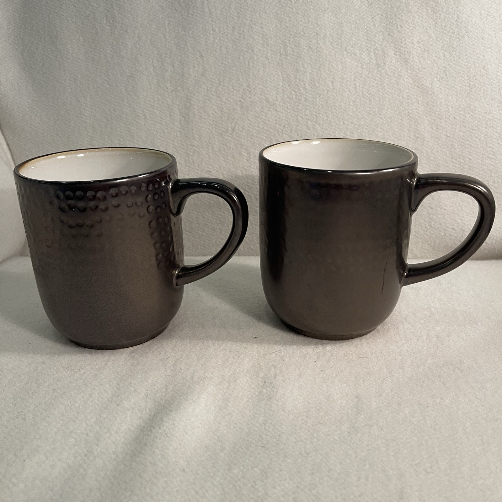 Elevate your morning routine with the Threshold Barney Bronze Stoneware Coffee Mugs. Each mug in this two-piece set showcases an elegant embossed dot pattern, enhancing the contemporary Barnet Bronze design. Crafted from durable stoneware, these round mugs are a blend of functionality and decorative appeal, ideal for any occasion. The mugs are designed to be both dishwasher and microwave safe, simplifying your daily chores. With a comfortable diameter of 3.5 inches and a height of 4.25 inches, they're the perfect size for your favorite hot beverage. The matte finish and art pottery production style make them a sophisticated addition to your home. Excellent condition. No chips or cracks.