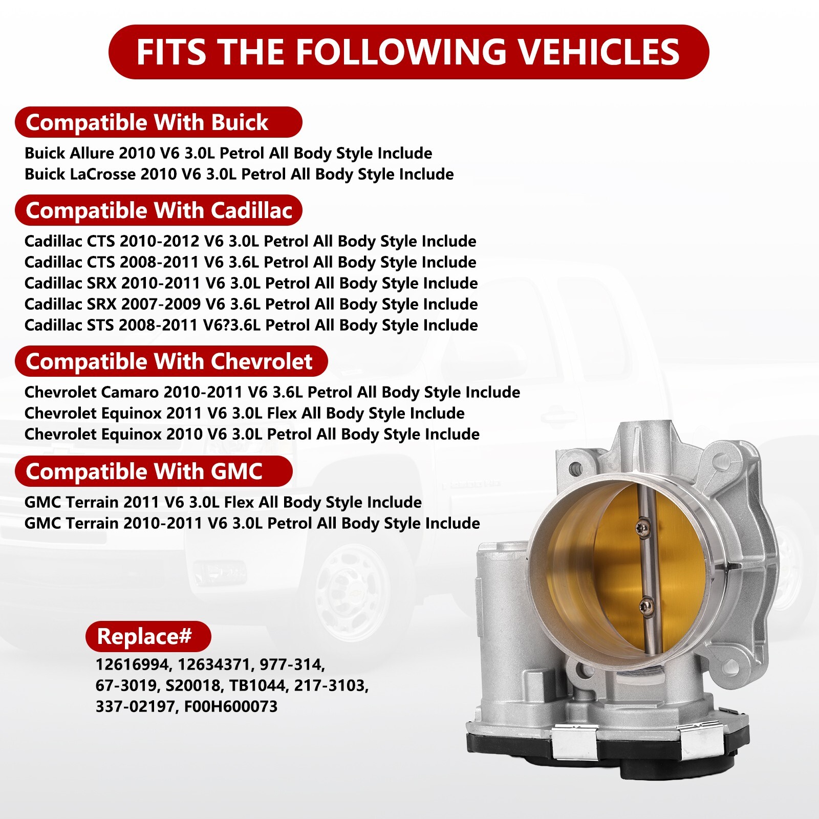 Store Categories Store Categories High Pressure Fuel Pump Liftgate Actuator Struts Oxygen Sensors Rear View Backup Camera Climate Control Panel Tire Press Monitoring System Master Power Window Switch Battery Current Sensor Shock Struts Suspension Fuel pump assembly Solenoid valve wiring harness Radiator Camshafts Throttle Bodies Other S20018 Throttle Body Fit GMC Terrain Chevrolet Equinox 3.0L Camaro 3.6L 6.2L 2010-2011 Product Description OE Number:?12616994, 12634371, 977-3 14, 67-3019, S20018, TB1044, 217- 3103, 337-0 2197, F00H600073 Vehicle Information: Make Model Year Engine Fuel Body?Style Sensor Buick Allure 2010 V6?3.0L Petrol All?Body?Style Include Buick LaCrosse 2010 V6?3.0L Petrol All?Body?Style Include Cadillac CTS 2010-2012 V6?3.0L Petrol All?Body?Style Include Cadillac CTS 2008-2011 V6?3.6L Petrol All?Body?Style Include Cadillac SRX 2010-2011 V6?3.0L Petrol All?Body?Style Include Cadillac SRX 2007-2009 V6?3.6L Petrol All?Body?Style Include Cadillac STS 2008-2011 V6?3.6L Petrol All?Body?Style Include Chevrolet Camaro 2010-2011 V6?3.6L Petrol All?Body?Style Include Chevrolet Equinox 2011 V6?3.0L Flex All?Body?Style Include Chevrolet Equinox 2010 V6?3.0L Petrol All?Body?Style Include GMC Terrain 2011 V6?3.0L Flex All?Body?Style Include GMC Terrain 2010-2011 V6?3.0L Petrol All?Body?Style Include Product?Specifications: Product?Condition: New Color/Finish: Gray,?Black Throttle?Body?Material: Aluminum,?Steel,?Plastic Connector/Terminal?Type: Blade Terminal?Count: 6 Inlet?Type: Round Outlet?Type: Round Throttle?Body?Actuation?Type: Electric Gasket?or?Seal?Included: No Idle?Air?Control?Motor?Included: No Throttle?Position?Sensor?Included: Yes Package?Quantity: 1 Packaging?Type: Box Fitment: Direct?Replacement Notes: - Fitment above is for reference only, please check the OE number, model and year before you purchase. - Installation instruction is not included, professional installation is highly recommended. - Please feel free to contact us if you are not sure whether the item is suitable for your vehicles, we will check for you and reply as soon as possible. - Please refer to the listing pictures for an accurate description of the parts included in the kit. Payment Policy Shipping Policy Returns Policy Warranty Payment Policy 1. We accept Paypal, Credit Card, Veno,Goggle Pay,American Express,Discover, Direct Debit, VISA, eCheck, or othe r methods, please kindly check Paypal for more information. 2. For multiple purchases, please add items to your Ebay shopping cart and pay once for entire order. Shipping Policy 1. All items will be shipped to buyer's ebay address. 2. All items will be shipped within 24 working hours upon receipt of payment, and multiple items might be combined shipping. 3. In most cases, delivery takes around 3-7 business days, it's highly depended on the efficiency of the shpping carrier. If your item doesn't arrive on time, please contact us immediately for further assistance. Please note there is no local pickup service available. 4. We do appreciate your purchase here. If you are astisfied with the item as well as our service, please kindly leave us a Positive Feedback to help develop our bu siness. Th ank you in advance. Returns Policy We have a friendly and dedicated customer support teams to handle any problems you come up with our products. Please contact us first via email or message for replacement, refund or technical problem caused by any reason. Warranty 30 Days Free Return and Money Back Guarantee. If you are not satisfied with your purchase, you can return the item with original packaging back to us for full refund, not any re-stock fee. The return cost should be paid by buyer. 5 Year Unl imited Mileage Quality Guarantee If you receive any w rong items, or damage during the transportation or defect items, we will accept the return and pay the return freight. Please noted that the return cost should be prepaid by buyer, we will issue the refund of return cost to buyer after inspecting the faulty item. The full refund or replacement will be available for all faulty items, including the original shipping cost. Please kindly contact us b efore return, our representatives will send you the detailed return instruction. The guarantee will be only for the cost of the item, we will not responsible for installation or other fees like labor expenses, towing expenses, additional repair expenses or other related expenses. Copyright © 2023 Dianxiaomi