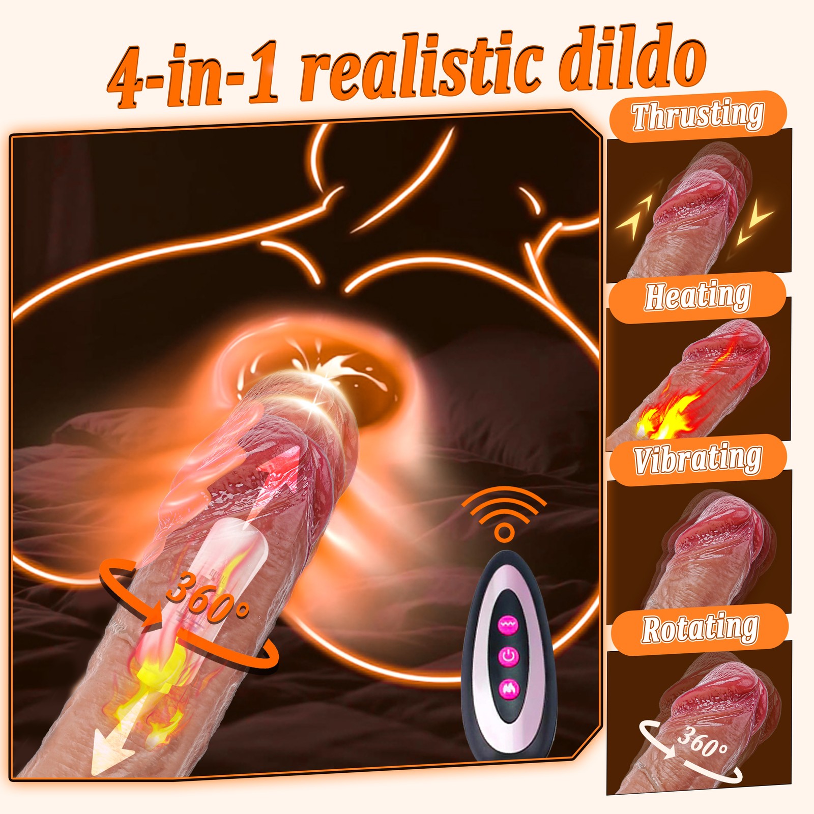DISCREET PACKAGING We will ship your package discreetly in an unmarked box, Your used id, name or information will only be available to us ,other buyer can't see If you have any questions, please contact us, We are care about your shopping experience and the performance of the product. Features(About the item): About this item: 【9 Vibration Modes】 Dildo built-in powerful motor in the glans part, featuring 9 vibration modes , providing intervals, continuous patterns, and high frequency but minimal noise.Ensuring intense and screet stimulation. 【5 Thrusting and Rotation Modes】 Short press thrusting / vibration button to cycle through the thrusting and vibration mode .5 thrusting modes can be selected . 【Realistic Thrusting Dildos Vibrator for Women】 - This g-spot dildo stimulator looks exactly like a real penis, with thrusting, vibrating, heating functions. The vivid glans of the dildo, the lifelike penis veins, the plump wrinkle ball, the thickly turned penis shaft, when you touch the dildo, experience the real touch stimulation, the strong stretching and vibrating stimulates the vaginal G-spot, and the warm heating design feels real skin temperature. 【 Remote Control Design for Womern Pleasure】 - The anal dildo comes with an original remote control that allows you to remotely control the product and switch thrusting and vibrating modes. From a remote control distance you can have your partner or friend stand at a distance and control your climax. It\'s really convenient to have this remote control for hands-free play when you\'re using the toy alone. 【Skin-Friendly Silicone Waterproof Material】 - This realistic dildos is made of silicone with a soft and silky skin-friendly design, just like real skin contact with vaginal stimulation. The dildo is waterproof design, you can feel passion in the water, compared to traditional toys, this toy is more deeply rooted in the heart, water fun, more play, and easy to clean and easy to use. 【Strong Suction Cup & Hands-Free Toys】 - This telescopic dildo toys is designed with powerful suction cups in mind for the variety of gameplay as well as ease of use, giving you a strong hands-free toy that allows you to enjoy a variety of positions. You can use it on any flat surface and stick firmly to smooth surfaces such as bathrooms, kitchens, bedrooms, wooden doors, tables, walls, floors. Specification *Rated voltage 3.7V, rated current 8A * Color: Flesh * Full length: 8.46inch(21.5cm) * Insertion length: 6.29inch(16cm) * Diameter: 1.38inch(3.5cm) * Waterproof: Easy to Clean, but Do not soak the motor in water * Remote control battery: 12V27A * Heating Fuction * Material: Liquid Silicone Notice: 1. Recommended for use with lubricants. 2. It usually takes 90-120s to to heat up,you need to wait for a moment to feel the heating function 3. Clean the product before and after usage. This dildo can not be immersed in water for a long time. 4. Keep it dry and save in a secret place; away from children Package Includes: Vibrator*1 Charging cable*1 Remote control*1 Manual*1