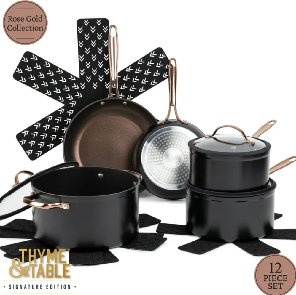 What’s Included: This set includes a generous 6-quart stock pot, a 2.5-quart saucepan, a 2-quart sauté pan, a 10-inch fry pan, and an 8-inch fry pan, equipping you for any culinary challenge. Additionally, it comes with 4 cookware protectors to keep your investment in pristine condition for years to come. Ultimate Engineering: Each piece is crafted to perfection using heavy gauged aluminum , ensuring exceptional results with every dish. Because of its stainless-steel induction base our cookware is engineered for all cooktops, including gas, electric or induction, and oven safe up to 350° Fahrenheit. Healthier Cooking and Non-Stick: The ultimate feature is its non-stick coating, allowing for quick cleanup, and helps to promote healthier cooking with effortless cleanup. Optimal Handling: Designed for ease and precision, our cookware features ergonomic riveted handles that provide superior grip and balance, ensuring safe and effortless maneuvering in the kitchen. Revolutionize your Kitchen: Capable of handling everything from frying and searing to simmering, braising, and boiling, this comprehensive set is designed to revolutionize your cooking experience. Offering versatility and durability in one stylish package, it elevates your kitchen setup. Enhance your culinary creativity with confidence using the Thyme & Table 12-Piece Ceramic Non-Stick Signature Cookware Set, Rose Gold. Use and Care: Dishwasher Safe, Handwash Recommended
