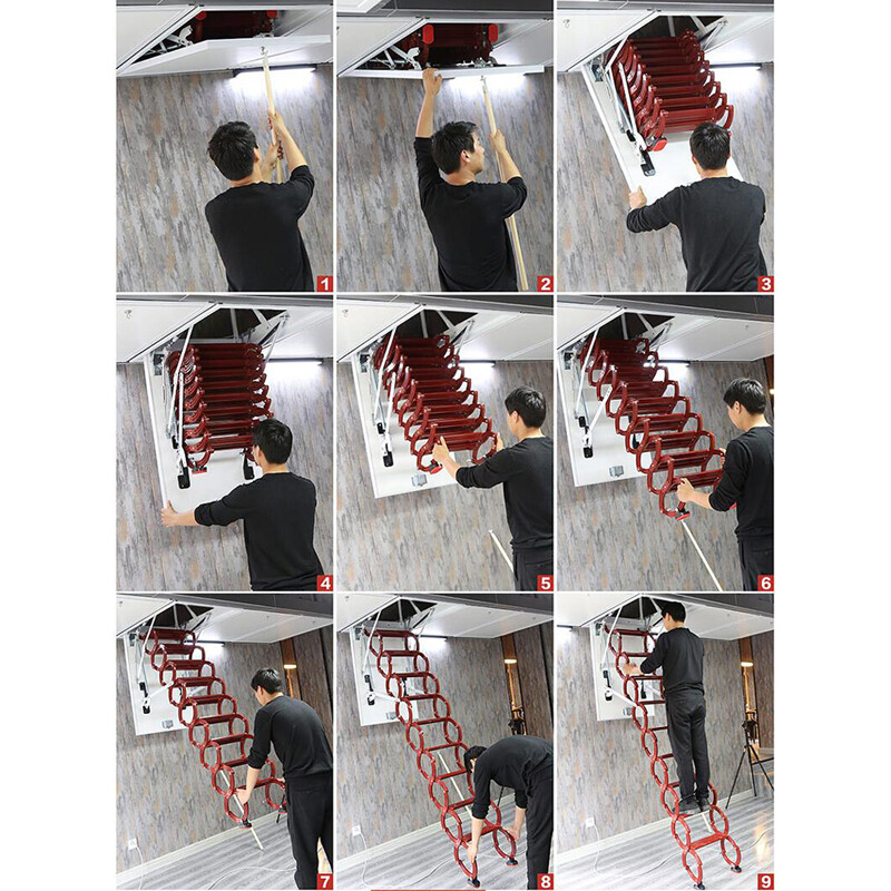 INTSUPERMAI® 12Steps Attic Ladder Ti-Mg Attic Pull Down Ceiling Ladder 9.8ft Folding Loft Ladder Stairs 9.8 Feet Height with 600LB Loading Capacity All Red Attic Stairs Attic extension ladder is becoming more and more popular recently because of its simple, elegant, practical, telescopic and small occupied area. The ladder can be widely applied to loft and the top of the cottage. It is very convenience to go upstairs and downstairs. Attic extension ladder meets the needs of most people about fashion and concise lifestyle. Attention Before operating the stairs, please read the instruction book thoroughly, and retain it for future reference. Before you purchase it, please clearly understand SIZE of the ladder [80*90 cm /31.5*35.4 in]. Features High quality environmental protection material. Key position adopts thickened material. Electrostatic coating process, anti-corrosion and antioxidant. Hydraulic rod and spring lets door-closing mute and andante. Rotational door lock becomes anti-lock, safe and convenience. Rubber anti-slide foot makes up or down safe and does not spoil the floor. Parameter Color All Red Material Ti-Mg alloy Open Size 31.5*35.4 in Max Vertical Height 9.84ft Opening Thickness ≥13 cm / 5.1 in Step Size 15.75 * 5.51 in. Width from Hole Edge to Wall ≥ 5cm / 1.97 in. Weight Capacity 300 kg / 600 lb Matters needing attention: 1.Please install the fixed frame according to the height on our website. If the installation height is not appropriate, please contact us to solve the problem! 2.When pulling down the ladder, do not stretch it backward too much. Just put it on the ground naturally. Excessive stretching will cause uneven stress and may cause tilting. If you are not sure about the stretching position, you can take photos to contact us! 3.If it is used for several months or frequently, you can check whether the screws are loose as a routine maintenance of the stairs. 4.If there is a fault during use, please contact us first, and do not repair it yourself to prevent improper maintenance! Maintenance Information Users are responsible for the proper operation and maintenance of the equipment they use. Some equipment will quickly become damaged and unsafe if abused or subjected to improper demands. If equipment is regularly maintained and not abused, you will get the maximum safety and service performance from loft wall ladder stairs. Do not overload ladder stairs. Do not knock it vigorously. Do not disassemble it casually. Do not open the tripod forcibly. Do not play movement on ladder stairs. These uses create severe impact and shock loads that may lead to steps and equipment failure. Installation Instruction Put the lock-rod into the lock hole. Lock the lock-rod by pin. Tighten the bolt of the four corners. Pull the ladder stairs up and fasten the lower edge of the hole. Put metal triangle panel on bolt and tighten it. Watch out when you install the ladder stairs. Do not stand under the hole when you install the ladder stairs. Check Equipment Periodically turn ladder stairs on its end or side and check the following: Look for broken welds or deck boards. Tighten loose nuts and bolts. Look for ladder stairs frame distortion caused by overloads and impact loads. All the check is for your safety. Item Include(022157) 80*90cm Red Ti-Mg Alloy Attic extension ladder*1 Wooden Package*1 Necessary accessories*1 Manual*1 Shipping & Handling Details Default Shipping Cost or Free Shipping Information: ▲ Default shipping cost or free shipping service is only for the customers from Canada or the lower 48 United States by Canada Post, USPS or the UPS Ground. Customers from other areas or needs other shipping ways, please contact us. ▲ Buyers from Guam, Puerto Rico, Virgin Islands, American Samoa, Alaska, Hawaii, PO Boxes, APO/FPO addresses or other countries/areas, there WILL be extra shipping costs, please contact us for more detailed information. ▲ Please make sure your address is valid for both UPS and USPS services. Any costs incurred because of incorrect or undeliverable address should be undertaken by buyer. Handling Time: Shipping is usually made in 1-3 business days after payments cleared. Orders are processed from Monday-Friday; Not on the weekends & public holidays. Sales tax / Customs duties: Any sales taxes or Customs duties are not included. If came out, they must be undertaken by the buyer. Damage In Shipping: Email or call us First! We will work with you to get the case resolved in the fastest method. Return / Refund If you are not 100% happy with your purchase, please contact Us. Please don't directly opened a request or case without informing us, or else, we will do some discounts on the warranty and other sales-services later on. Hope for your understanding. Returns & Exchanges ▲ All returns must be made within 14 days of delivery date. Items must be in new, unused condition, with all original materials included with the shipment. A partial refund may be applied for opened or damaged items, depending on the condition. ▲ Items returned under the buyer’s remorse: The return shipping fee must be covered by the buyer; The original shipping cost will also be deducted from the refund. 15% restocking fee of the items purchase price will be charged. ▲ Returns that are the result of our seller's error: Buyer will receive a full refund of the item as well as shipping charges ▲ All returns require a RA (Return Authorization) number that will be given by our seller. Please contact with us at first for more details. Defective & Damaged Products ▲ If product was received damaged or not as described, please send us some pictures or videos, so we could well understand your problem, then solve them for you ASAP. Besides, it's much helpful for us to claim with UPS, remind our related department to pay much more attention to packaging later on. Hope for your understanding. ▲ Replacement or refund of defective or damaged products can only be returned in exchange fo