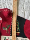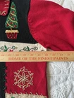 Festive Tiara International Christmas Collection 2004 women’s zip-up cardigan sweater featuring embroidered and appliqué holiday motifs including poinsettias, holly, Christmas trees, snowflakes, and gifts. Beautiful patchwork design in red, black, green, gold, and cream tones with gold stitching accents and a Christmas tree zipper pull. Perfect for holiday parties, “ugly sweater” contests, or cozy festive wear — this piece captures classic early 2000s Christmas charm.