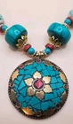 This beautiful handcrafted necklace is a stunning example of Tibetan jewelry artistry. The intricate beadwork and use of natural stone make it a unique piece that will be treasured for years to come. The large round pendant features red and turquoise color stone inlay and brass accents. The necklace is made of red and turquoise color beads. The round pendant is 2" across. The necklace measures 21 inches in length and weighs 3.5 ounces. It is perfect for anyone wants to add a statement necklace with a touch of cultural elegance to their wardrobe. This necklace is in good condition. Includes black gift box.