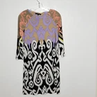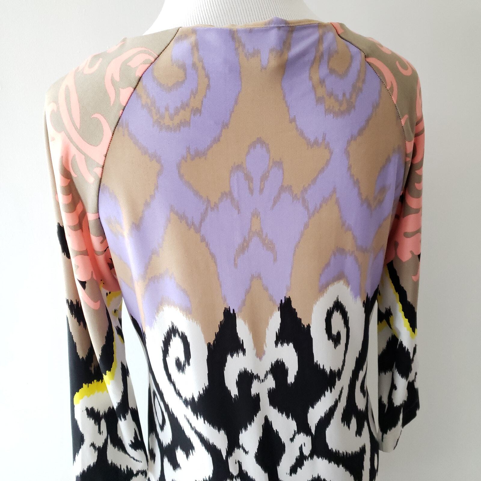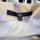 Tibi dress Size small 94% polyester/6% polyurethane Dry clean Pullover styling Shift silhouette 3/4 sleeves Scoop neck Bodice is printed lavender and tan Skirt is black and white swirl print Sleeves are pink, yellow, white, black Moderate stretch Approx. lay-flat measurements: Pit to pit: ~18" Length: ~35" Excellent pre-owned condition. No notable flaws/signs of wear