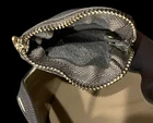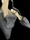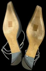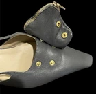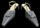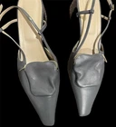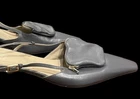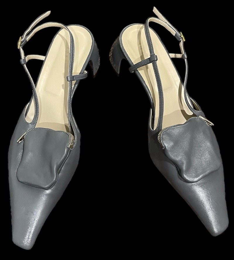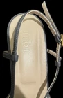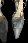 The Tibi Victor Slingback Pumps in gray with a pointed toe shape are a stylish and versatile choice for various occasions. **Please see photos for minor scuffing to backsides of heel. These heels feature a low kitten heel and a buckle closure for added comfort and convenience. The standout feature of these shoes is the detachable pocket zip pouch, adding a practical touch to a fashionable design. Made of leather with a leather insole, these pumps are durable and luxurious, perfect for the fashion-forward woman looking for a chic and practical footwear option.