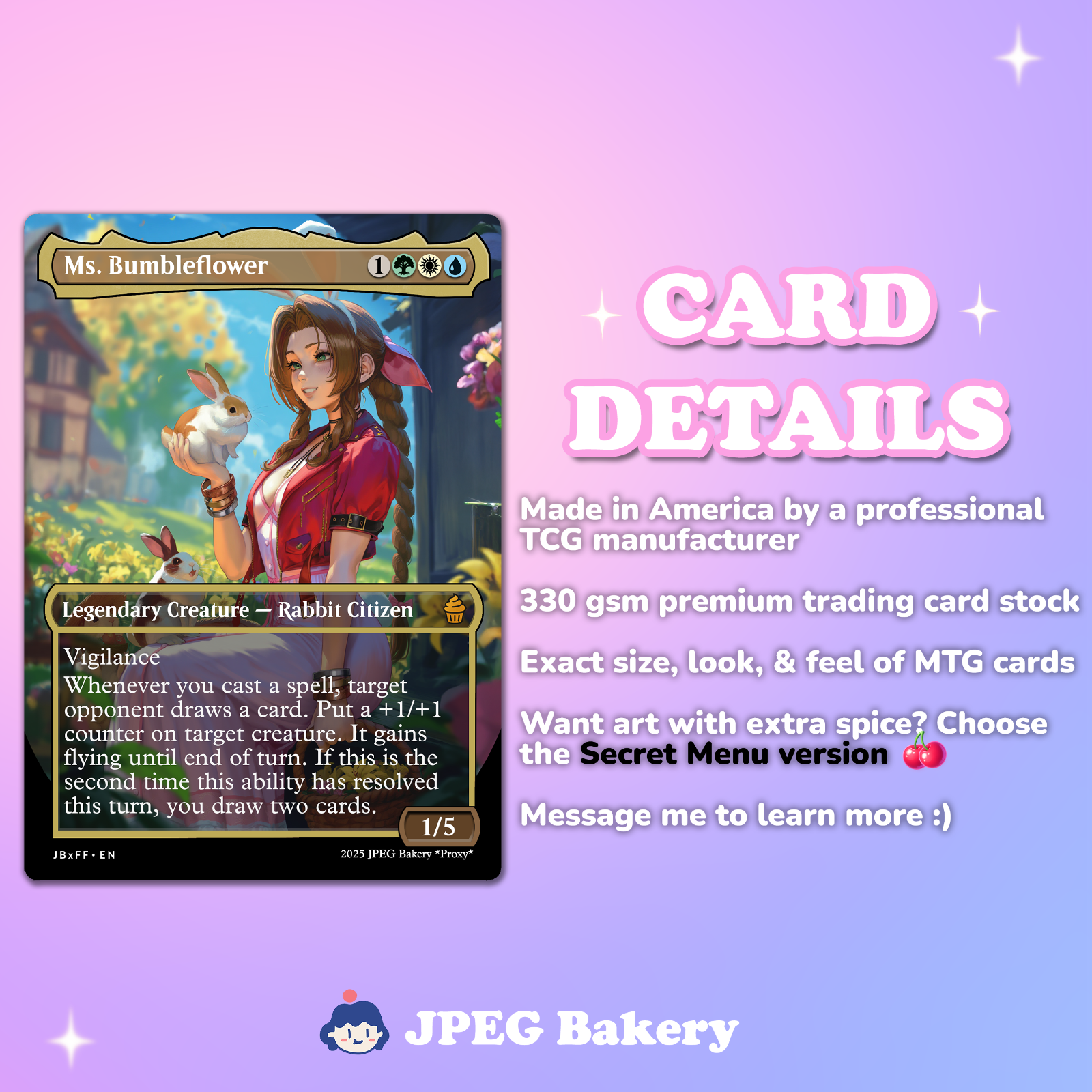 π The Commander Upgrade Bundle! 5 powerful high-value proxies to boost your deck's strength, plus 2 variants of the main commander, and 1 variant of the backup commander (8 cards total). Choose V1, V2, or the V1+V2 bundle ^_^ Card List: Tidus, Yuna's Guardian Yuna, Grand Summoner Doubling Season The Great Henge The One Ring The Ozolith Kodama Of The West Tree π§ Professionally Printed, Deliciously Designed Printed on high-grade trading card stock with a vivid gloss finish, these cards are made to feel great in the hand and shine at the table. Whether you're sleeving them up or displaying them proudly, each card is made with love and attention to detail. π¨ Art That Enhances Flavor Designed to complement your collection or deck with a unique aesthetic, these cards blend fantasy themes and rich visual storytelling. We use a mix of digital illustration and assisted workflows to create visually rich designs that complement gameplay and theme. π Casual Play Only - Not Tournament Legal Fresh from JPEG Bakery, these collectible cards are ideal for casual games, thoughtful gifts, or showing off your collection. They are not tournament legal and are not officially endorsed by any game publisher.