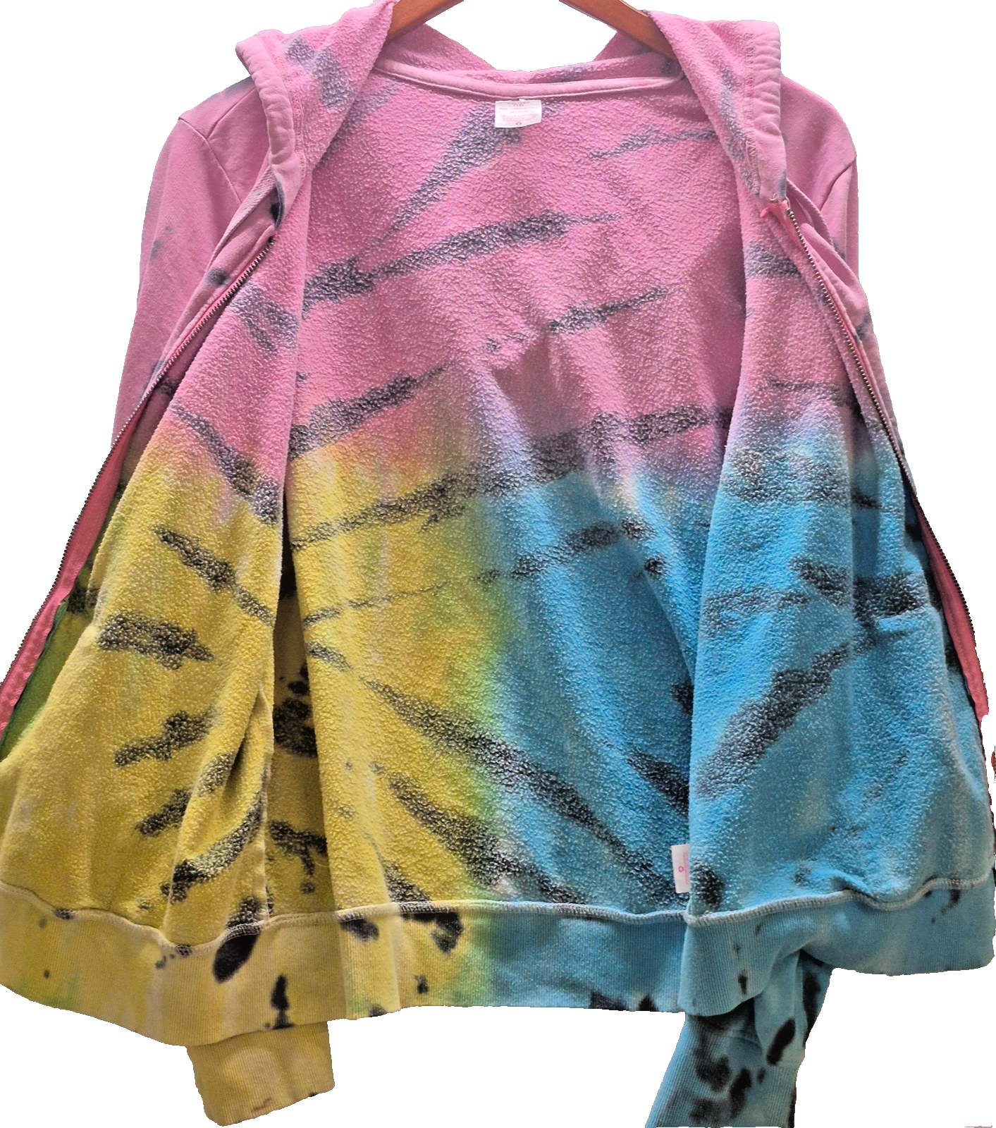 Love this colorful hoodie! The tie-dye pattern is so fun, and the lightweight fabric makes it great for layering or throwing on when there’s a chill. The full-zip design is super convenient, and the fit is roomy and comfy—runs like a women’s L/XL. Only a tiny stain on the cuff, barely noticeable. Perfect for casual wear!