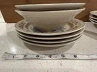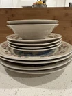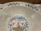 Add a touch of country charm to your dining table with this set of Tienshan Pig Pal stoneware dinner plates. The set includes four round plates, a dessert plate, and a bowl, all featuring a cute and playful pig pal pattern in multicolor. The plates are oven, microwave, and dishwasher safe, making them perfect for use in any occasion. These original late 20th-century plates were manufactured in China using the art pottery production style and finished with a glossy look. The set is perfect for farmhouse-style decor and is sure to impress your guests. The Tienshan Stoneware product line is known for its high-quality and durable pottery, making these plates a great addition to your collection. These dishes are in excellent condition and from a smoke-free home.