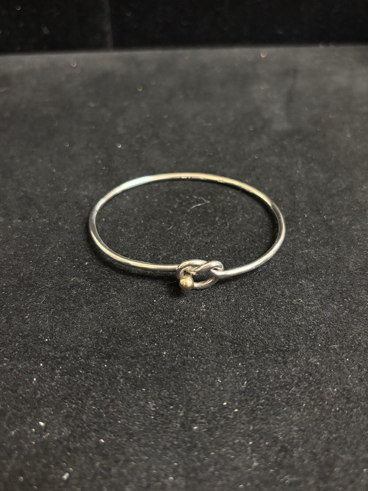 TIFFANY & CO. 925 STERLING AND 14K GOLD LOVE KNOT BANGLE BRACELET IN SIZE 6. IN EXCELLENT CONDITION, WITH NO VISIBLE FLAWS OR SIGNS OF WEAR. IT IS SLIGHTLY MISSHAPEN FROM USE BUT DOES NOT AFFECT COMFORT.