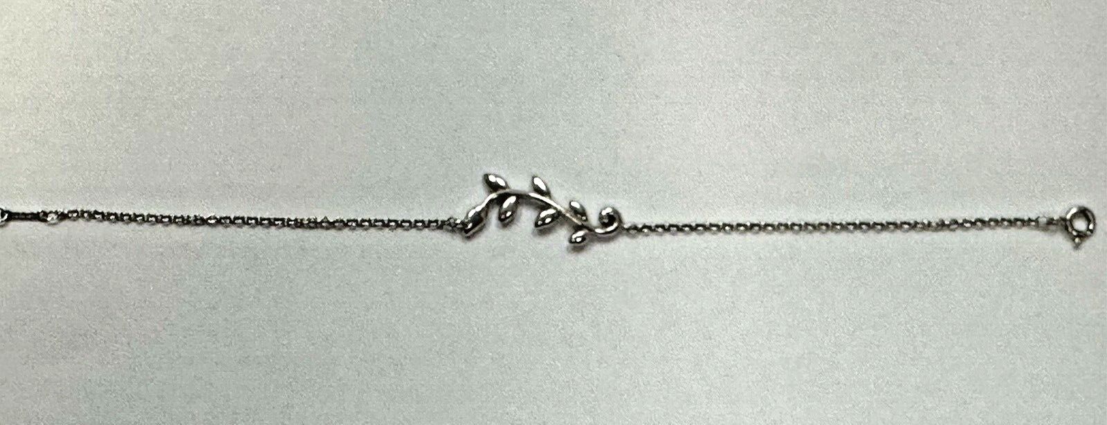 This Tiffany & Co. bracelet is from the Paloma Picasso collection, made of sterling silver with an olive vine leaf design. It measures 7 inches in length, features a spring ring closure, and is signed by the brand. DOES NOT COME WITH BOX OR PAPERS