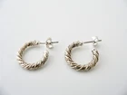Offered for sale is a pair of Tiffany and Co. Sterling Silver 18K Gold Rope Hoop Earrings. The style is classic Tiffany, making it a piece that you will most certainly use over and over again. Great piece to wear to work, or for just going to dinner with friends in jeans or a pretty dress. Super versatile and chic piece! It's like a piece of art - right on your ears! Because the earrings are two tone, it will go well with all of your other pieces - whether it be sterling silver, white gold or yellow gold! :) Definitely a wonderful Tiffany piece to start or add to your collection. As always, the item is fully hallmarked and is guaranteed to be 100% authentic. Wonderful present for yourself or anyone you love! Will surely delight! Particulars: Size & Measurements: The earrings are approx. 0.75 inches. Metal & Hallmarks: T& Co / 925 (on earring posts) T & Co / 925 / AG (on earring backs) Solid 925 Sterling Silver and 18K Gold Please check out my other unique and interesting Tiffany items on sale.