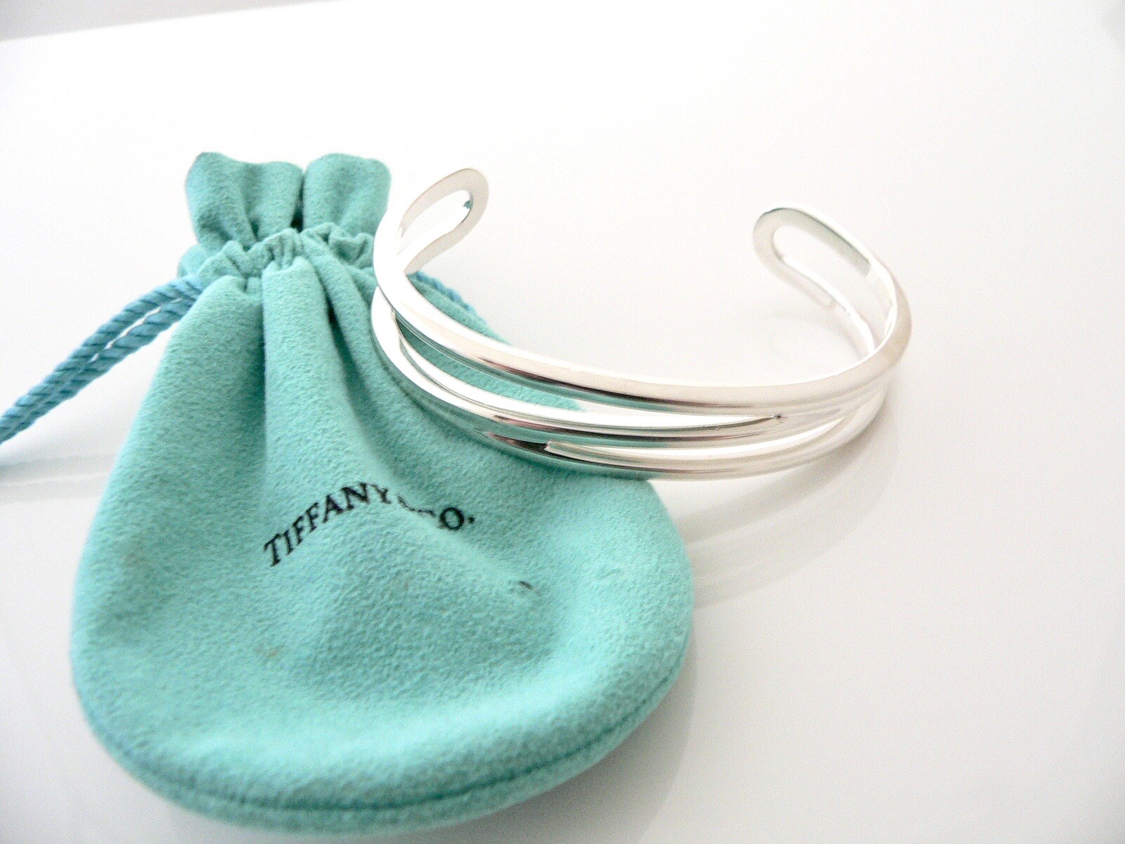 Overview: Offered for sale is a very rare and wonderful Tiffany and Co. Silver Double Diagonal Cuff. This piece is made from solid Tiffany silver, and yet has a very dainty and feminine touch to it. Very elegant, versatile, and comfortable piece! Great cuff to wear to work, or for just going to dinner with friends in jeans or a pretty dress. The style is classic Tiffany, making it a piece that you will most certainly use over and over again. A great Tiffany piece to start or add to your collection. The piece is fully hallmarked and is guaranteed to be 100% authentic. It will come with its Tiffany pouch as shown! Please note: The pouch has signs of wear. The matching earrings and ring are also available for sale in separate listings. Please have a look. Wonderful present for yourself or anyone you love! Will surely delight! Particulars: Size & Measurements: The cuff is 2.5 inches at its widest ends. Metal & Hallmarks: Tiffany & Co. / 925 / Italy Solid 925 sterling silver Please check out my other unique and interesting Tiffany items on sale.