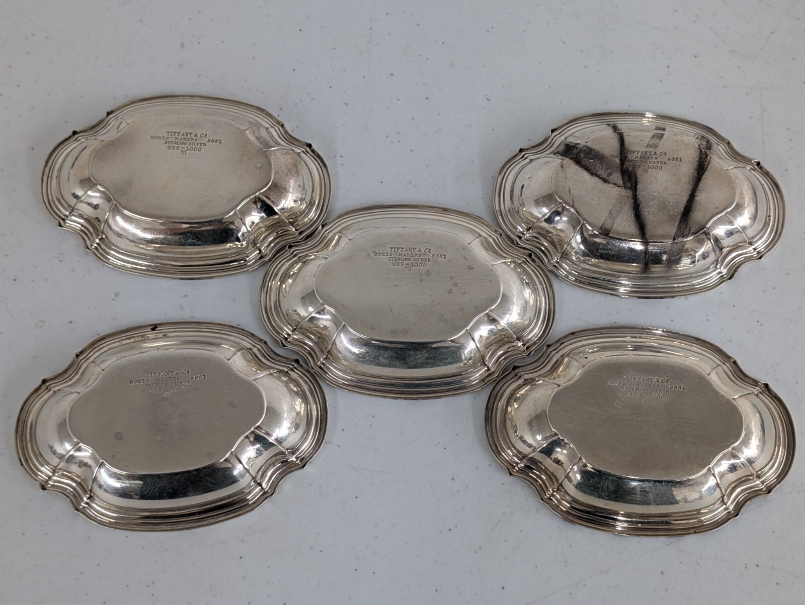 The product is a set of five Hamilton nut dishes made by Tiffany & Co. The dishes are crafted from sterling silver with a composition of .925, making them a luxurious and elegant addition to any antique collection. The brand, Tiffany & Co., is known for its high-quality craftsmanship and timeless designs, ensuring these dishes are not only functional but also a stylish conversation piece for any dining table or collection.