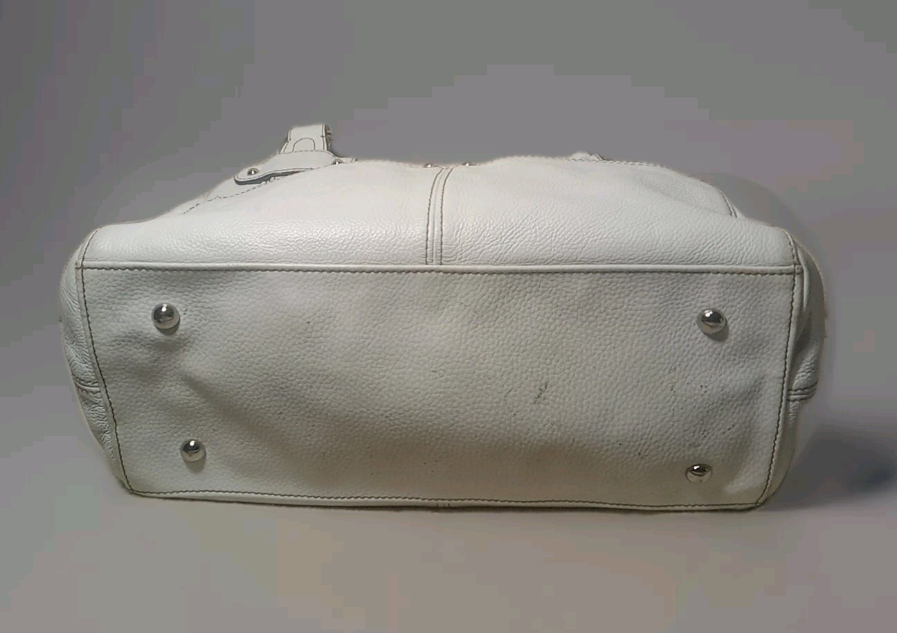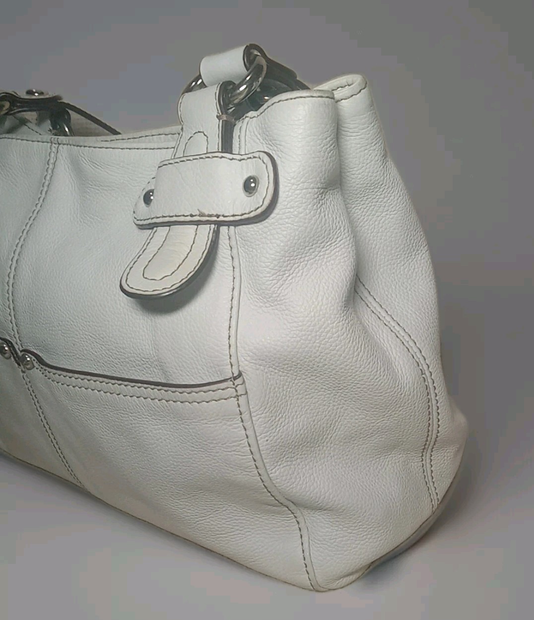 The Tignanello White Leather Shoulder Bag Purse is a stylish and classic accessory designed for women. Made of high-quality leather in a solid white color with silver hardware accents, this medium-sized bag features a rectangular shape and a zip closure. It includes inner and outer pockets, bottom studs, and a shoulder strap handle in white leather with a 11-inch drop. The bag is from the Tignanello Perfect Pockets product line and is perfect for everyday use, adding a touch of designer flair to any outfit.