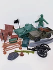 Tim - Mee Jeep Vintage Cannons Tank Tents Canoe Ammo Box Army assortment . Assorted plastic add on Pieces lot of 18 the jeeps steering wheel is missing some parts to the cannons are missing. Soldier is 4" in hight . It's a cool add on lot.