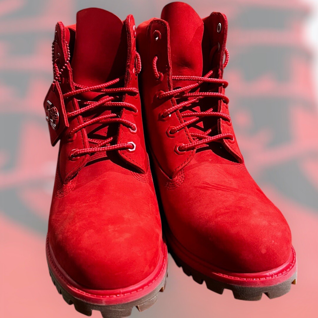 The Timberland Premium 50th Anniversary 6" Waterproof Red Boots in size 5 feature a stylish ankle bootie design with a round toe and lace-up closure. These unisex boots have a low block heel and a medium calf width, making them suitable for various occasions including travel, weddings, parties, and workwear. Made of waterproof nubuck upper material and featuring a rubber outsole, these boots are perfect for the winter and fall seasons, offering both style and comfort with their premium construction by Timberland.