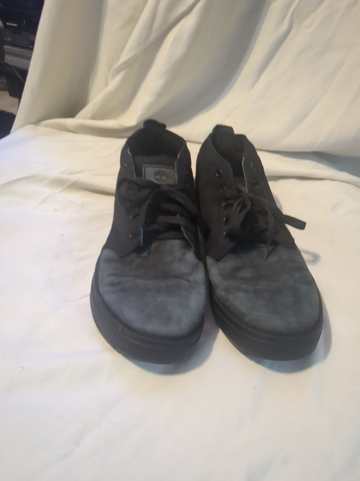 These Timberland boots are men's size 11.5 in black leather with blue suede accents. They feature a lace-up closure, ankle shaft style, and round toe shape. The chukka style boots are suitable for travel, casual wear, and work. They have a rubber outsole for comfort and cushioned insoles. Perfect for all seasons.