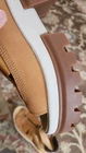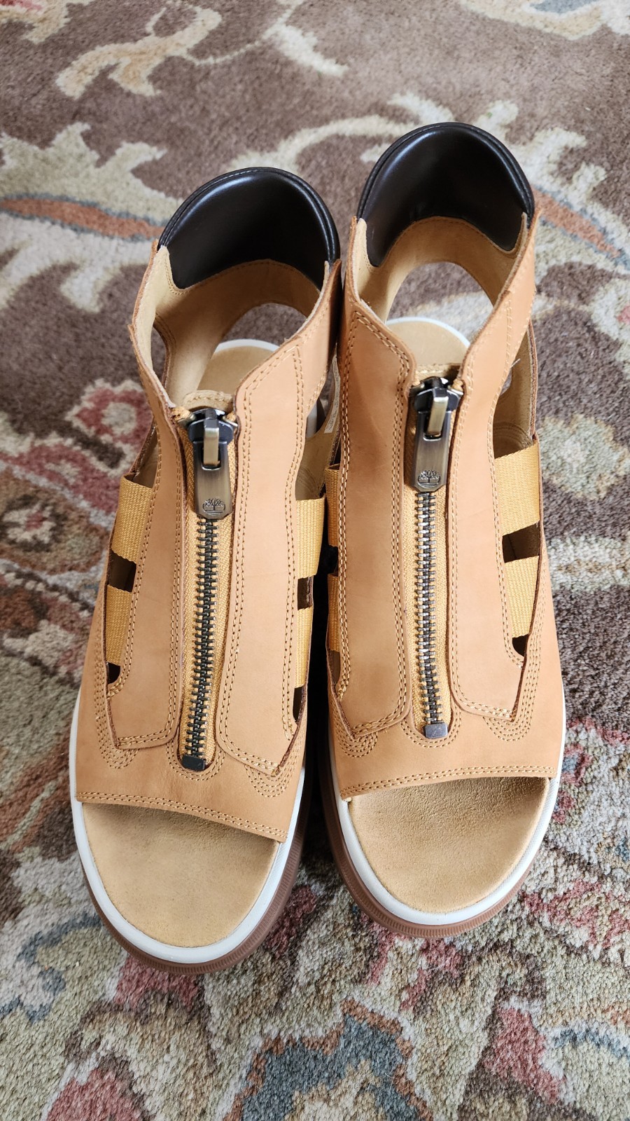 Timberland platform sandals in excellent pre-owned condition. Really comfortable. Only worn a few times. Has some very minor creasing and discoloration on the soles. Otherwise no flaws. Fit true to size. Smoke free home.