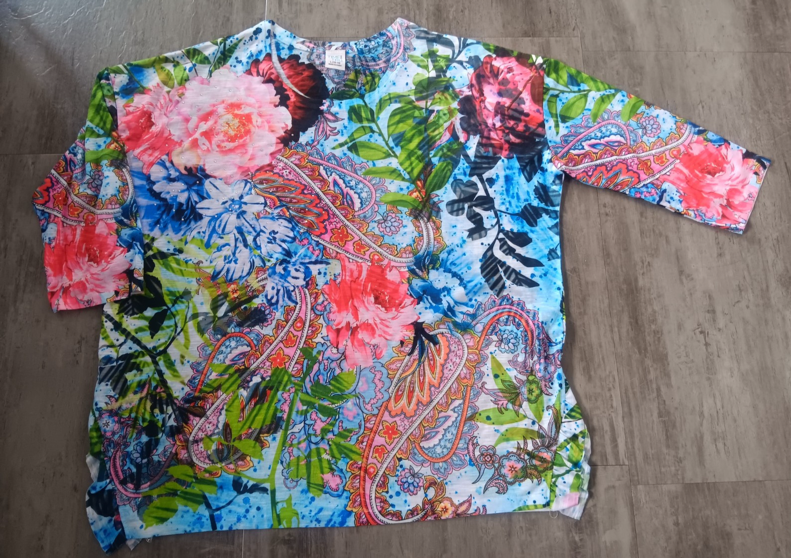 Time And Tru women's multi-colored floral top with embellishments and 3/4 sleeves size L. 70% polyester, 30% recycled polyester Multi-colored floral design; rhinestone accents; 3/4 sleeves; round neckline, ruffled slits Measures 27"L, 25" pit to pit and 14" sleeve length Machine wash, tumble dry Excellent, like new condition! This may not have been worn. Please refer to photos as they are part of the description. Please ask if you have any questions. Payment is due within five days. Please look at the other items I have listed as I will combine shipping. Your item will be carefully packaged. If it arrives damaged, it is the buyer's responsibility to file a claim with the shipping carrier. Please do not leave negative or neutral feedback before contacting me with any issues as there is usually a solution to the problem. Returns will not be accepted after 30 days. Thanks for looking. DP