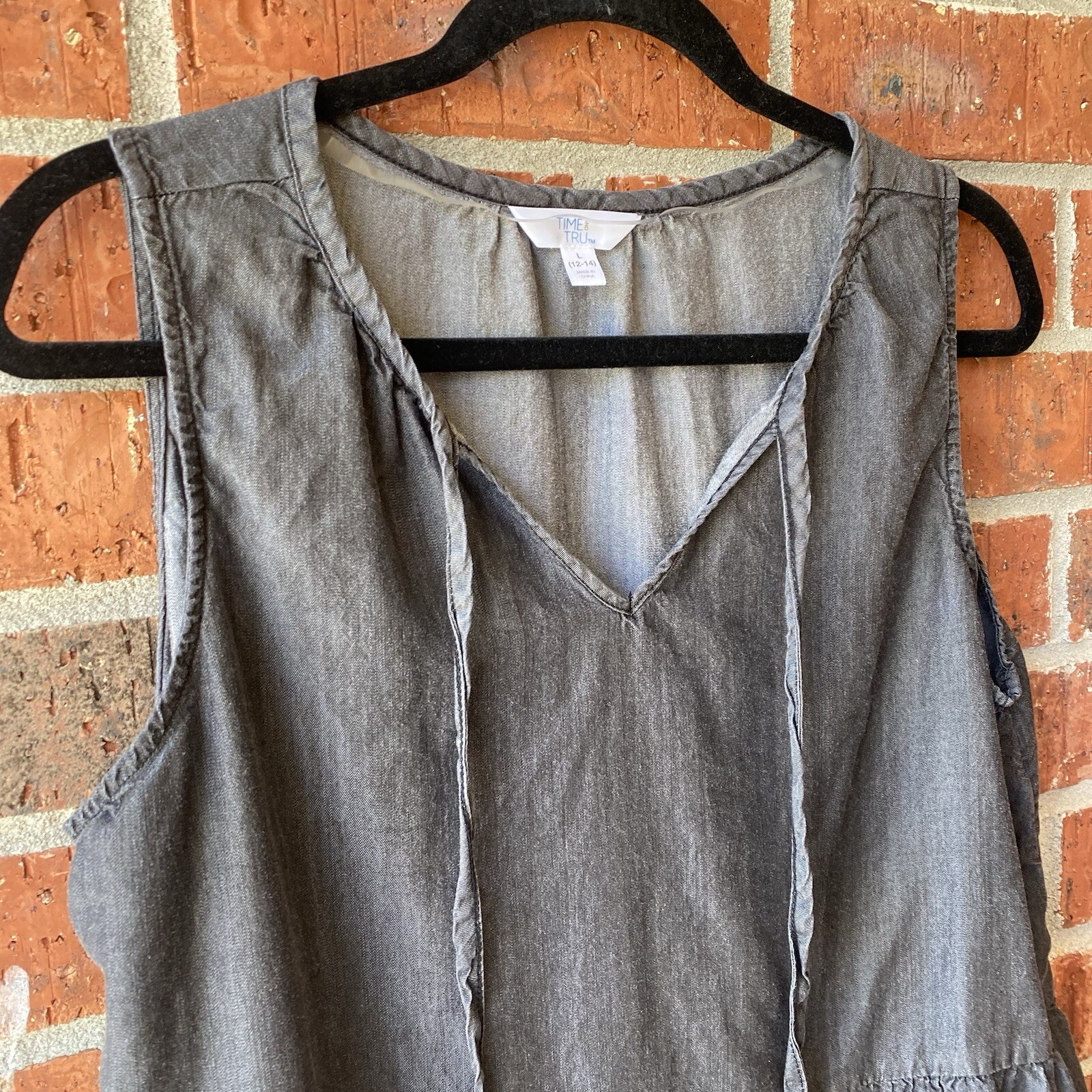 Love this blouse! The tie-front detail and ruffles add such a cute, feminine touch. The chambray fabric is soft and comfy, and it fits perfectly. Great condition—looks almost new! Super happy with this purchase.