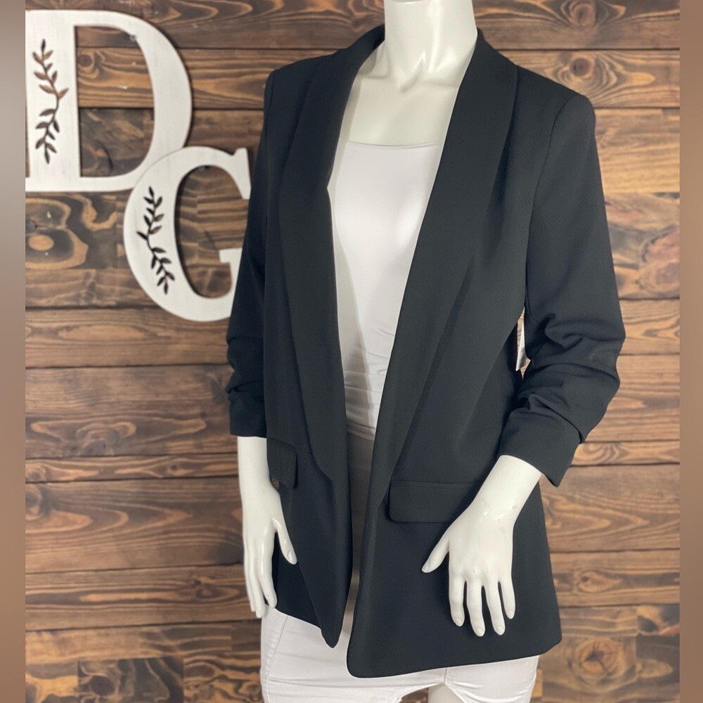 This black semi-fitted blazer from Time and Tru showcases a sleek, open-front style crafted from soft knit fabric. Its hip-length cut and minimalist design make it a versatile addition to any wardrobe. Ruched quarter sleeves, faux pockets, shoulder pads, fully lined. ▪️Material: 97% Polyester 3% Spandex Lining: 100% Polyester Approximate Measurements⬇️ ▪️Length Shoulder to Hem: 28 in. ▪️Pit to Pit: 20 in. (Stretches to 22 in.) ▪️Arm Inseam: 13 in. ▪️Condition: NWT. New with tags. ▫️NO TRADES/HOLDS▫️ALWAYS open to reasonable OFFERS, send them before someone else does!!▫️Bundle 2 or more items to SAVE MORE!